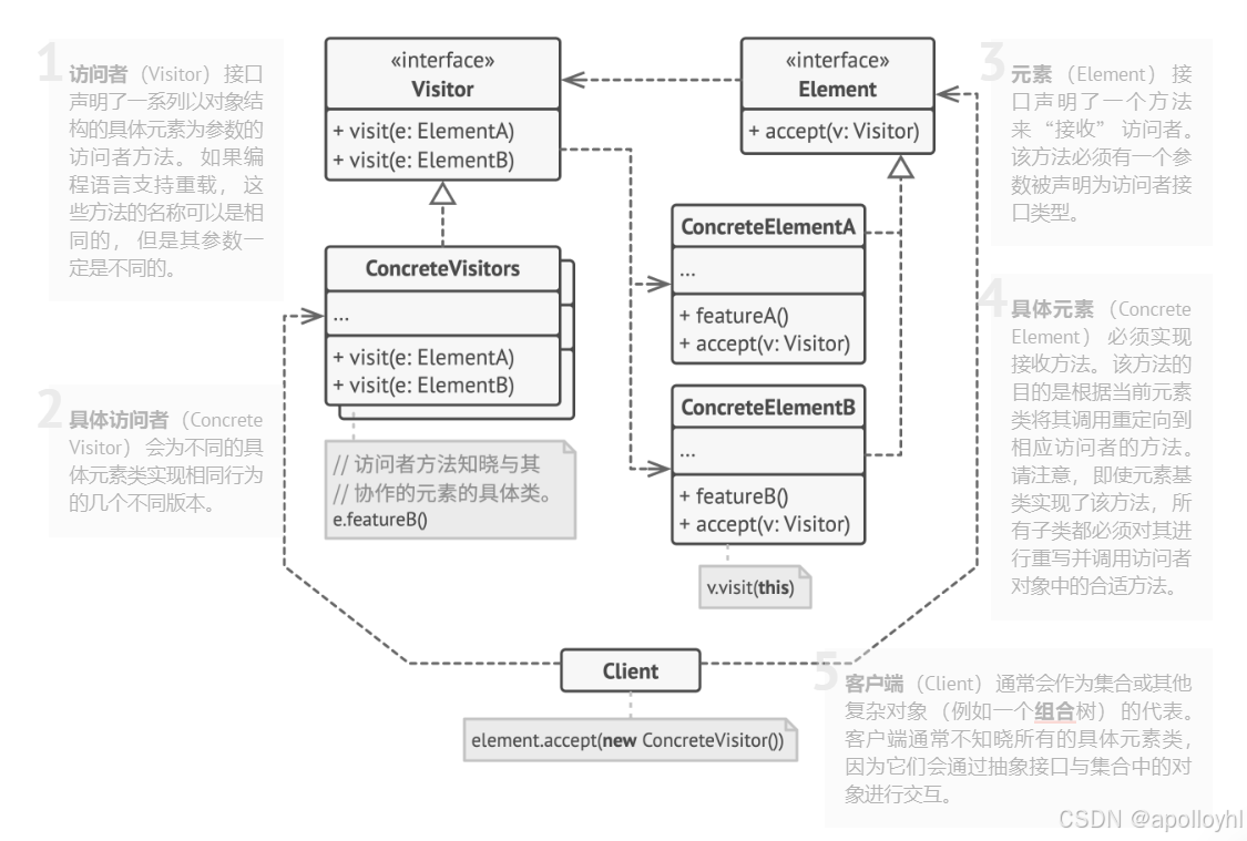 - 在访问者同某个元素进行交互时, 它们可能没有访问元素私有成员变量和方法的必要权限。