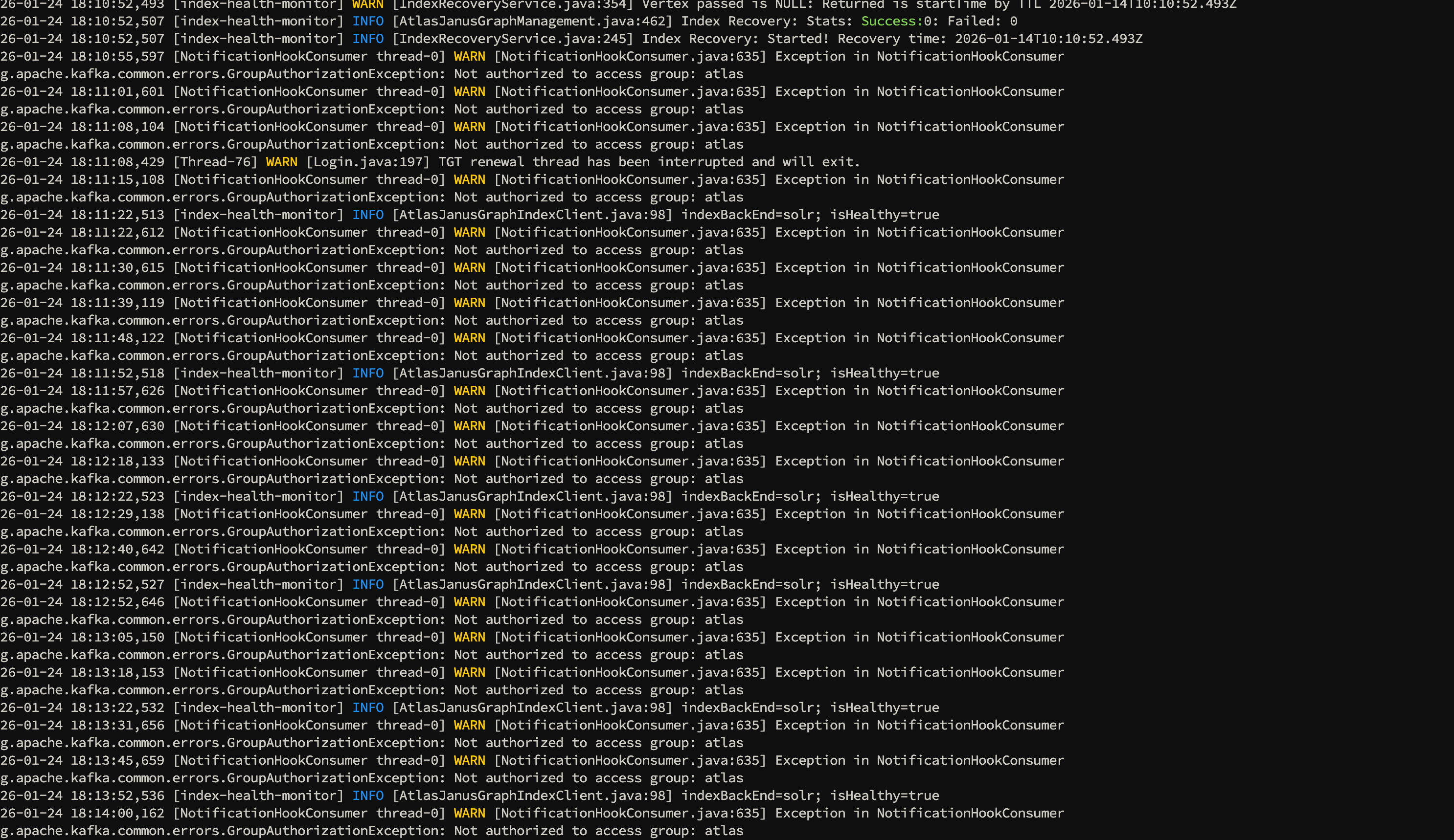 2026-01-24 18:13:22,532 [index-health-monitor] INFO [AtlasJanusGraphIndexClient.java:98] indexBackEnd=solr; isHealthy=true