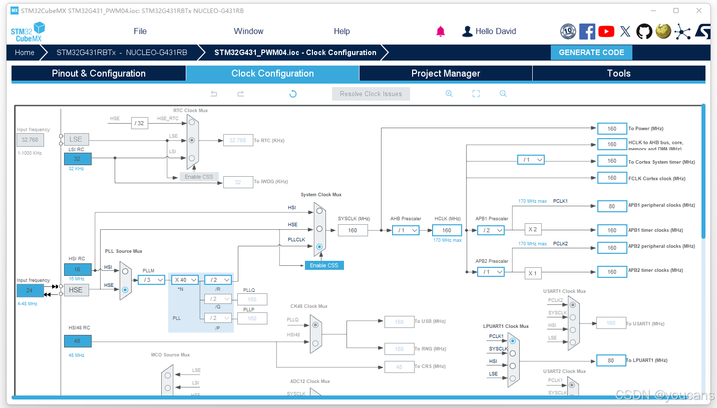 (2)设置输入频率 Input frequency = 24 MHz,系统主频 SysCLK frequency = 160 MHz