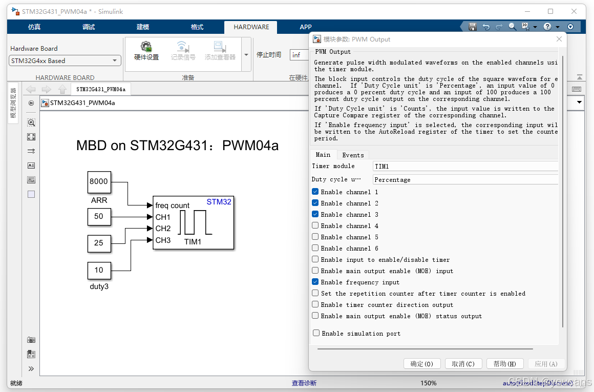 - 如果 Simulink 中 TIM 模块使能了(勾选 Enable frequency input,在 Simulink 中设置 ARR),则 Simulink 的 ARR 生效,CubeMX 的 ARR 会被覆盖。