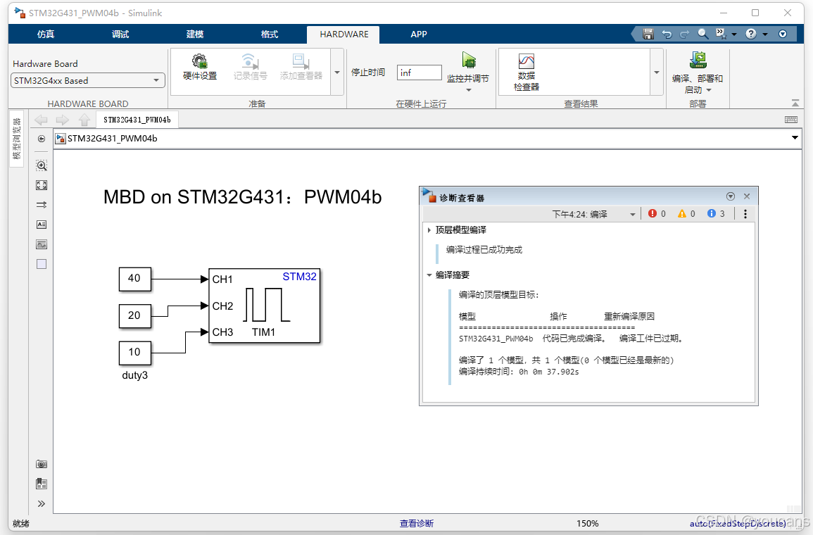 在 Simulink 中打开仿真模型 STM32G431_PWM04a.slx,在 "硬件(Hardware)" 选项卡中点击 "编译、部署和启动"(快捷键 Ctrl + B)。