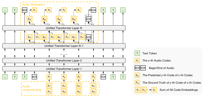 图解:音频理解与生成架构。理解走多层残差嵌入加和,生成走 NCP 分层预测。