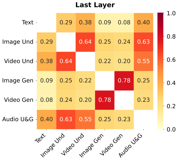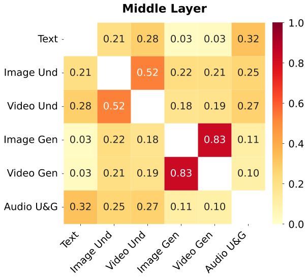 图解:不同模态 top-25% 激活专家的 IoU 重叠。深层跨模态重叠增强,表明语义逐步统一。
