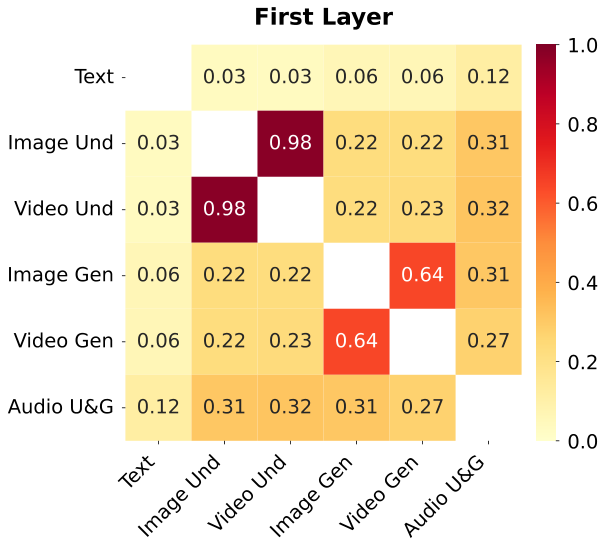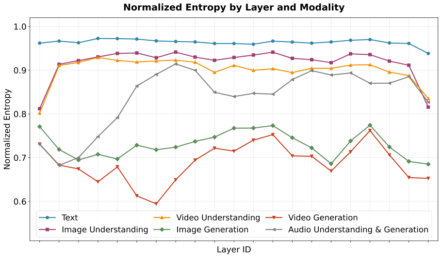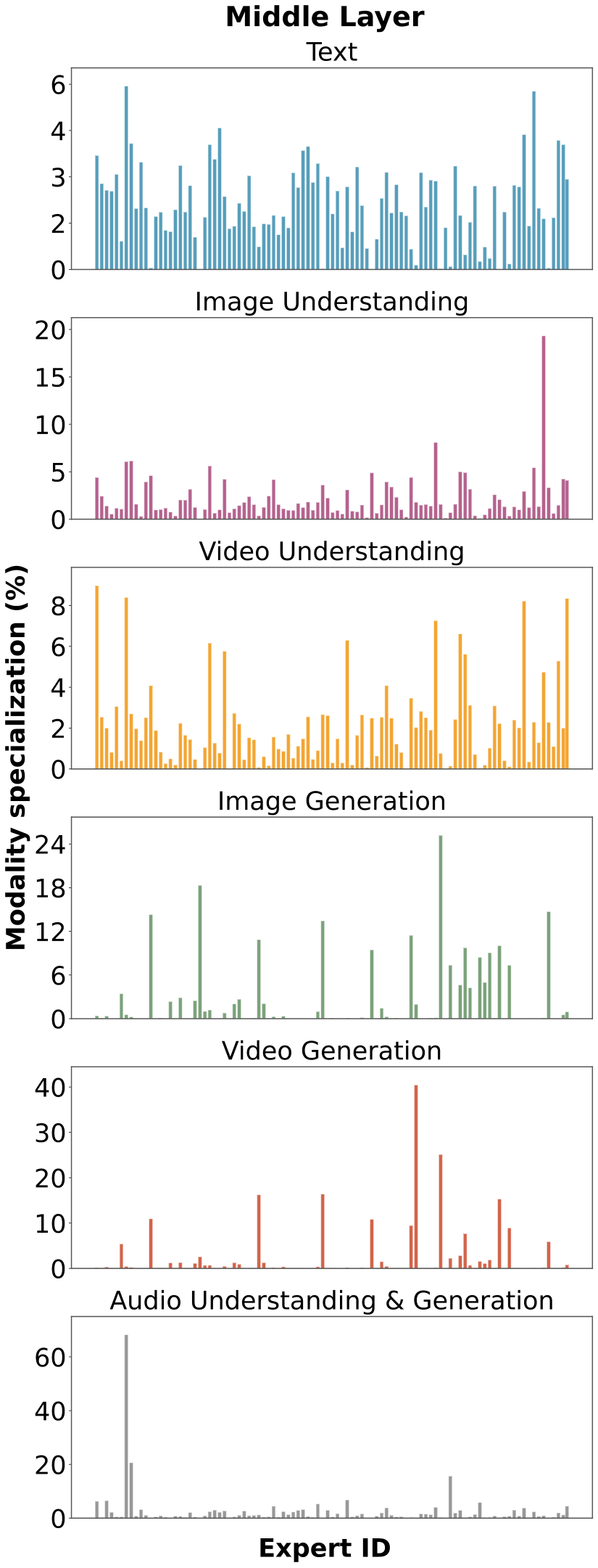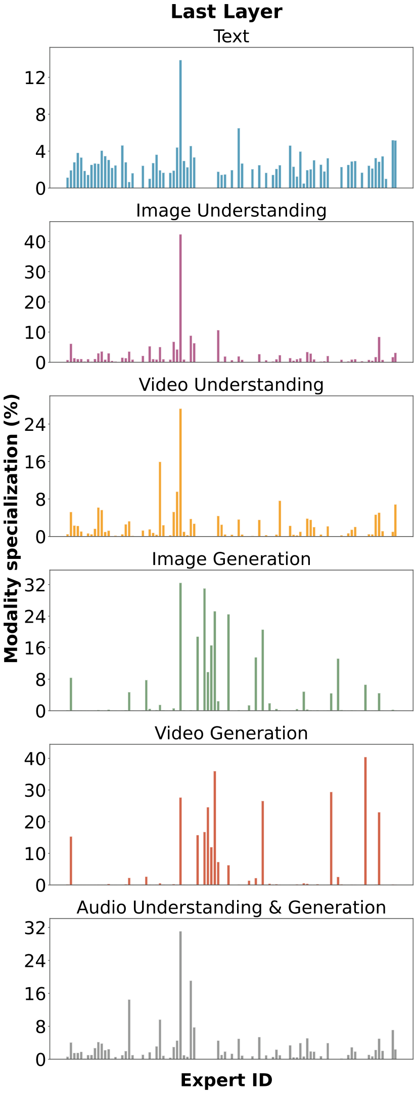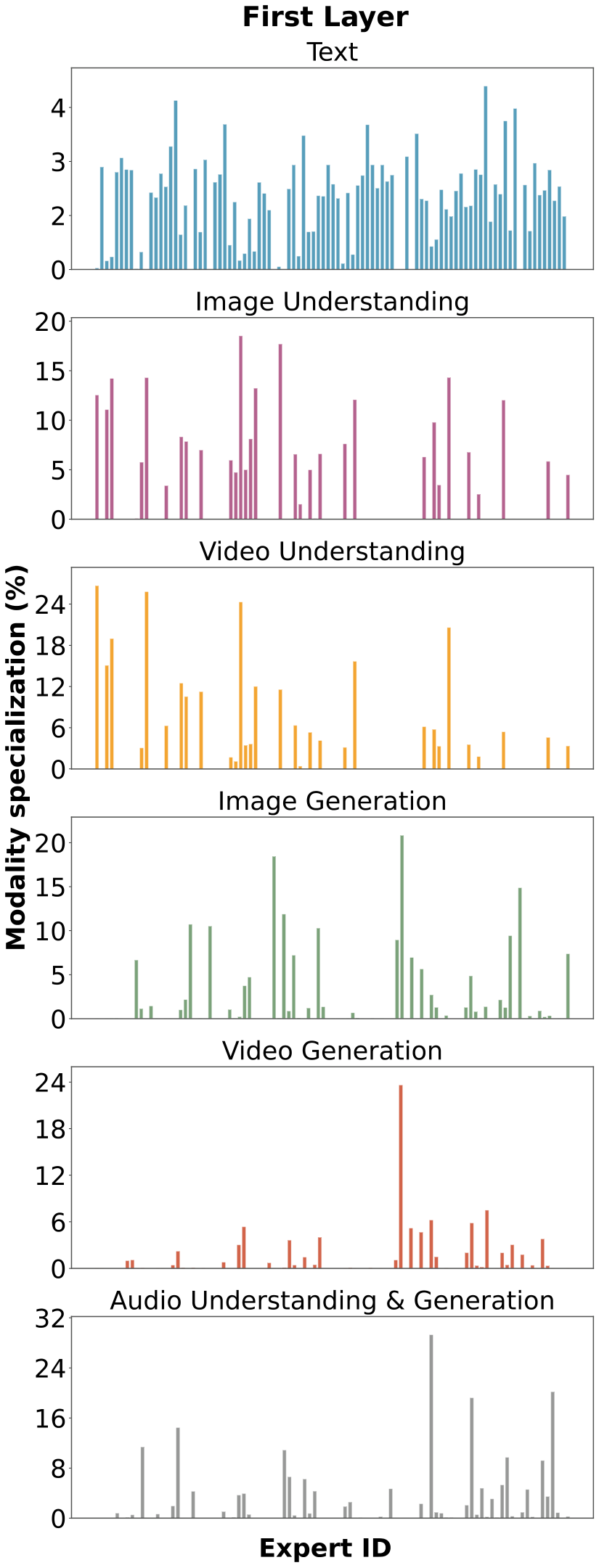 图解:不同层专家激活分布。可以看到非均匀激活,专家在模态上自然分化。