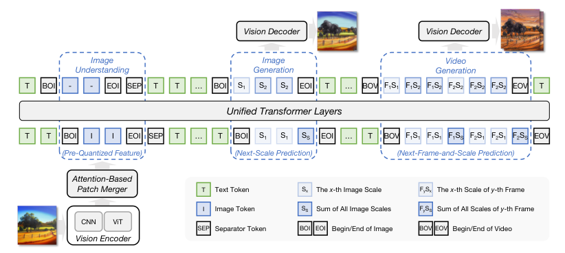 - 统一序列化 :文本、图像、视频、音频都映射到共享 token 序列。