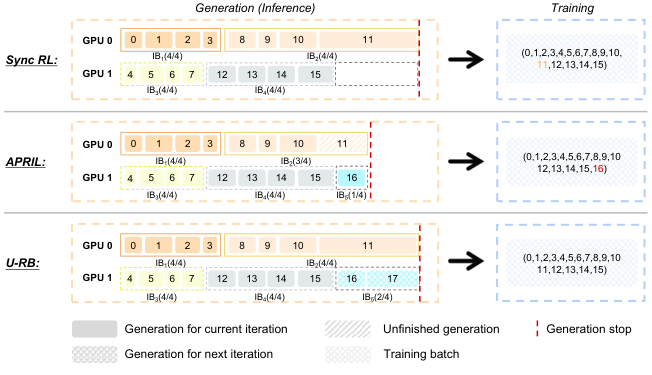 - Unbiased Replay Buffer (U-RB) :避免长尾 rollout 阻塞。