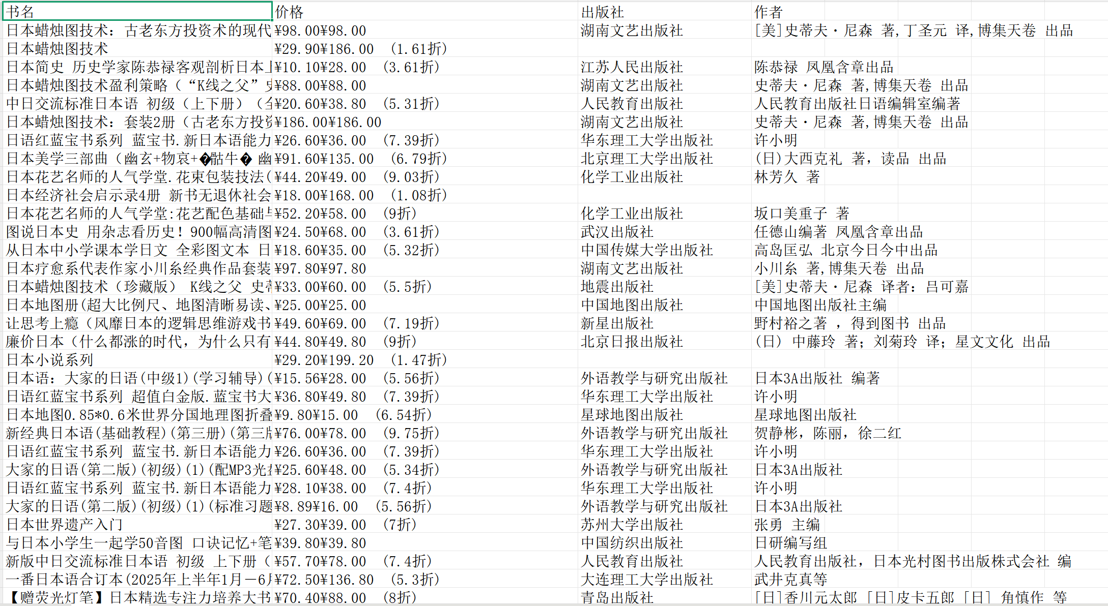 我发现很多对日本文化、历史或文学感兴趣的朋友,或者做出版市场分析的小伙伴,想批量了解市面上相关图书的情况。手动去网站一页页翻,效率太低了。