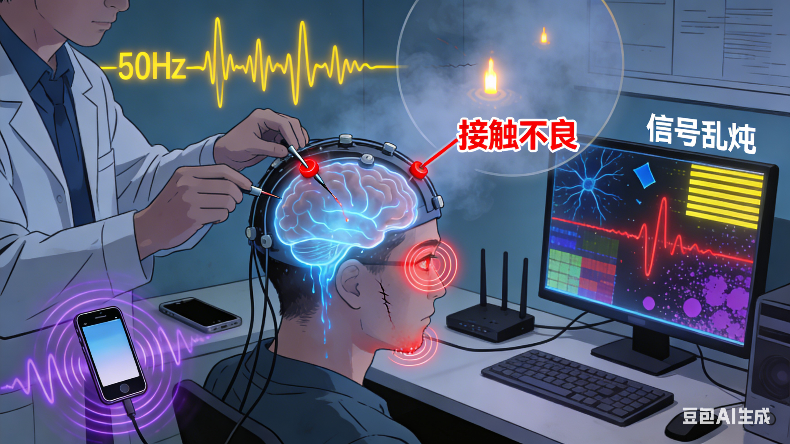 可咱们的"听诊器"------电极,工作环境却像个摇滚音乐节 。50赫兹的市电哼声是永恒的背景音 ,强度是脑电的上百倍。用户一眨眼、一咽口水,肌电信号就像观众突然的尖叫 ,瞬间淹没一切。更别提电磁环境 世界了:手机的辐射、路由器的信号、甚至别人走路带来的静电,都在咱们的脑电图里"刷存在感"。