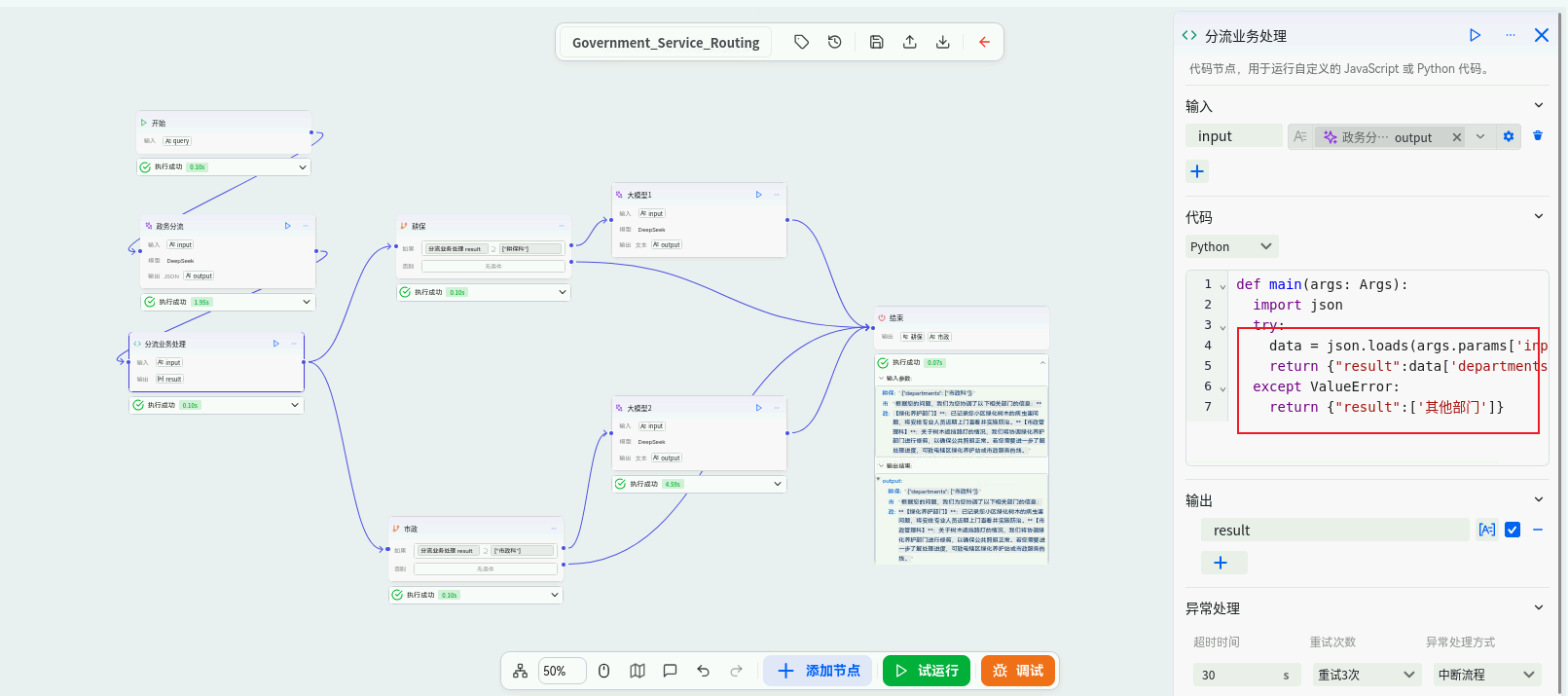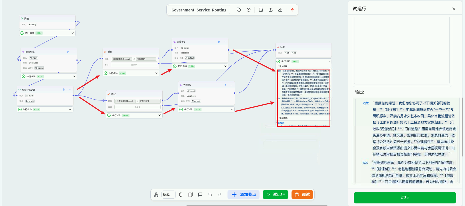 调试与优化:如果输出不符合预期(如科室识别错误、回复不专业),返回检查分类LLM节点的提示词、各科室知识库的完整性,以及应答LLM的系统角色设定,进行微调。