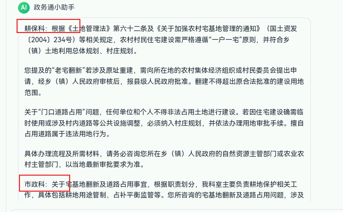 - 多部门测试 :我家老宅翻新,涉及宅基地和门口道路占用,该怎么办?",检查回复是否同时包含了市政科,耕保科的解答,且整合得当。