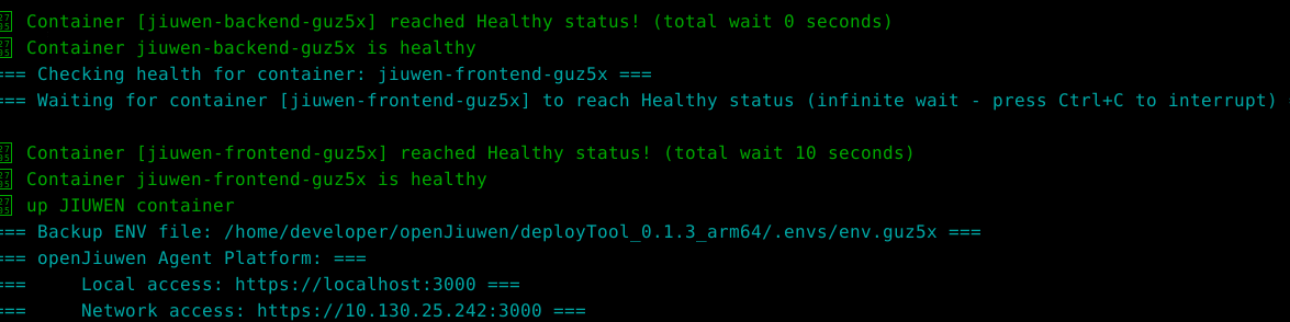 openJiuwen项目根目录,执行启动命令。bash./service.sh up此脚本将自动拉取所有必要的Docker镜像(包括前端、后端、数据库等)并启动容器组。