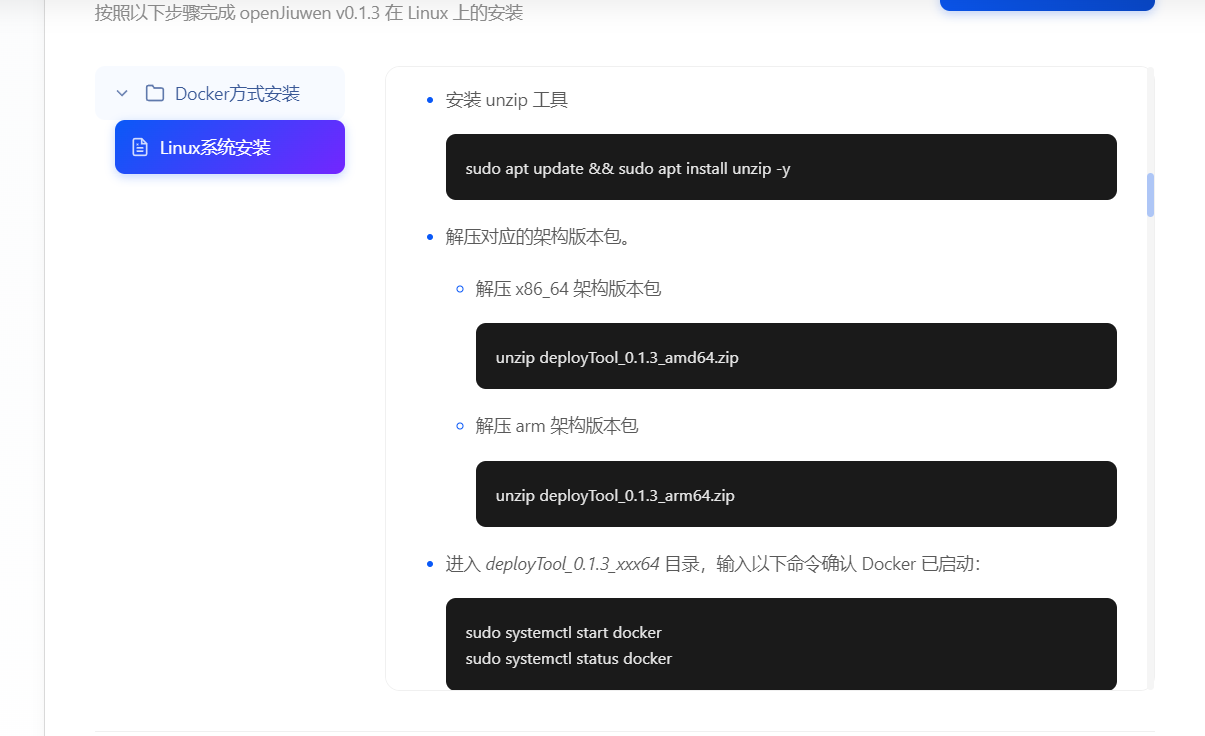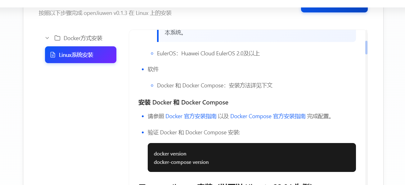3 安装依赖 :确保宿主机已安装 Docker 和 Docker Compose。这是运行 openJiuwen 所有服务的唯一前提。