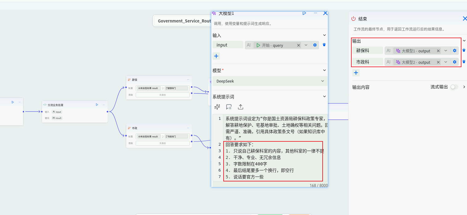 - 市政科节点:系统提示词设定为"你是市政管理科工作人员,负责解答道路维修、绿化养护、排水疏通、公共照明等市政设施相关问题。回答应具体、可操作。"
