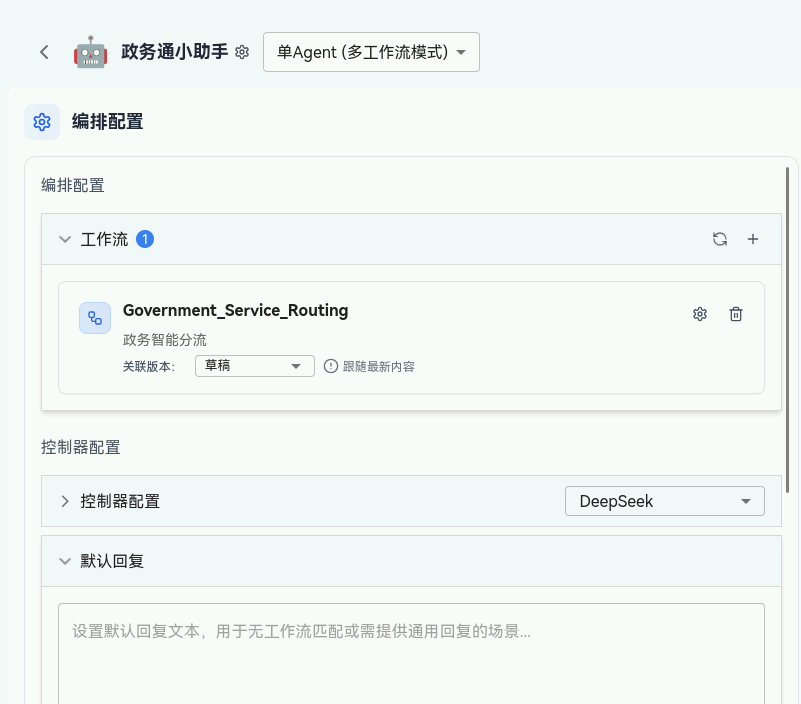 - 保存配置。这意味着所有发送给该智能体的公众咨询,都将被转发给这个工作流进行智能识别与分流处理。