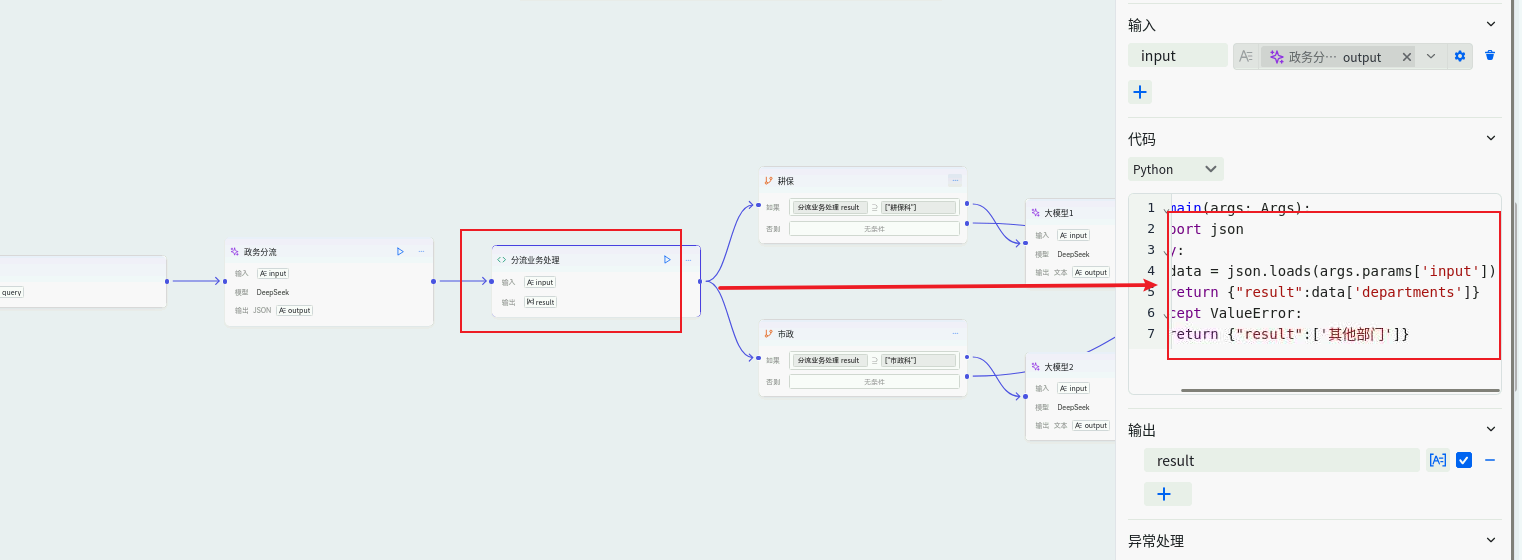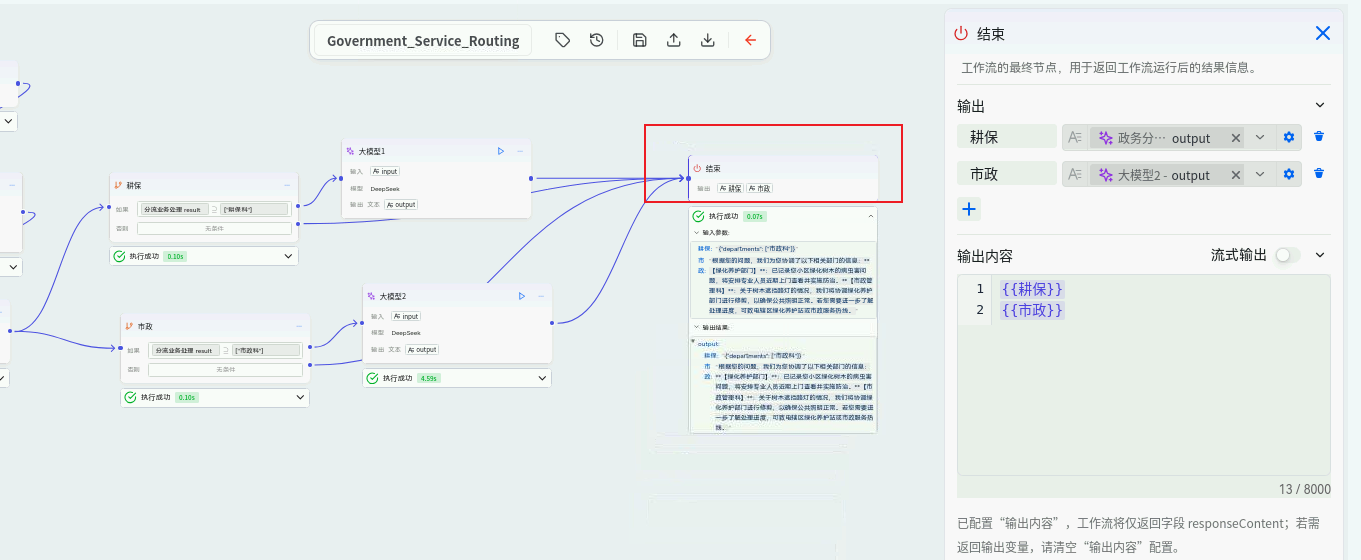 - 返回工作流,检查 结束节点的输出模板,确保其能正确处理多部门输入并优雅格式化。
