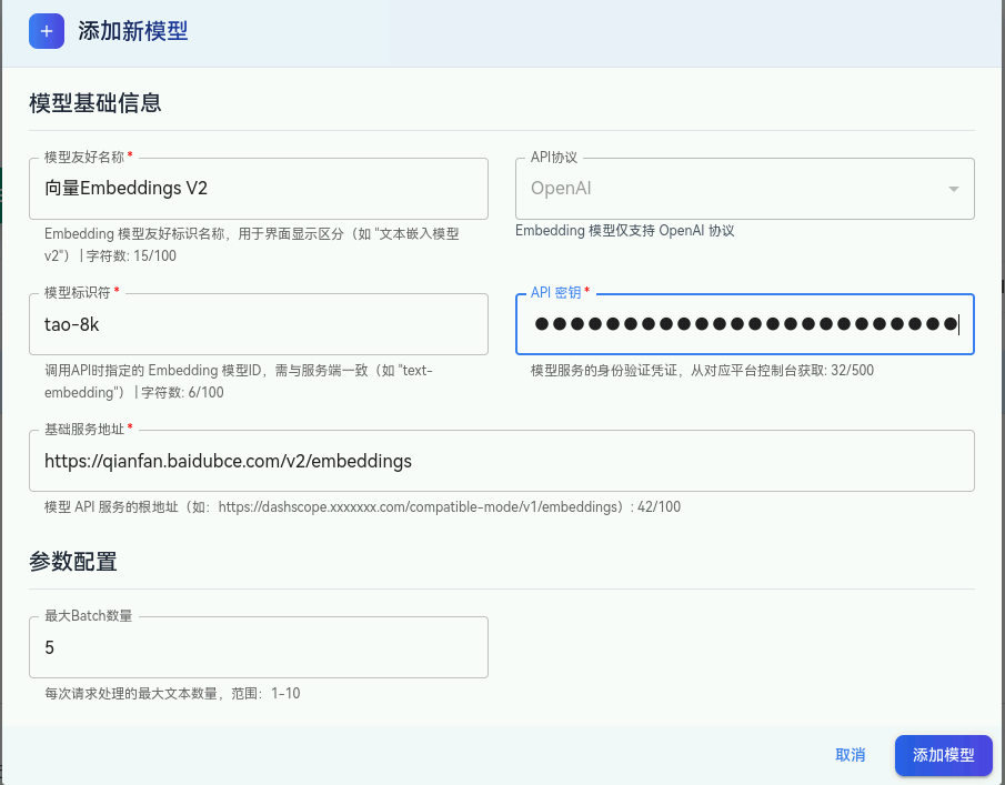 - 关键配置 :根据您选择的模型提供商(如 华为、讯飞星火、文心一言、通义千问、GPT等),填写相应的