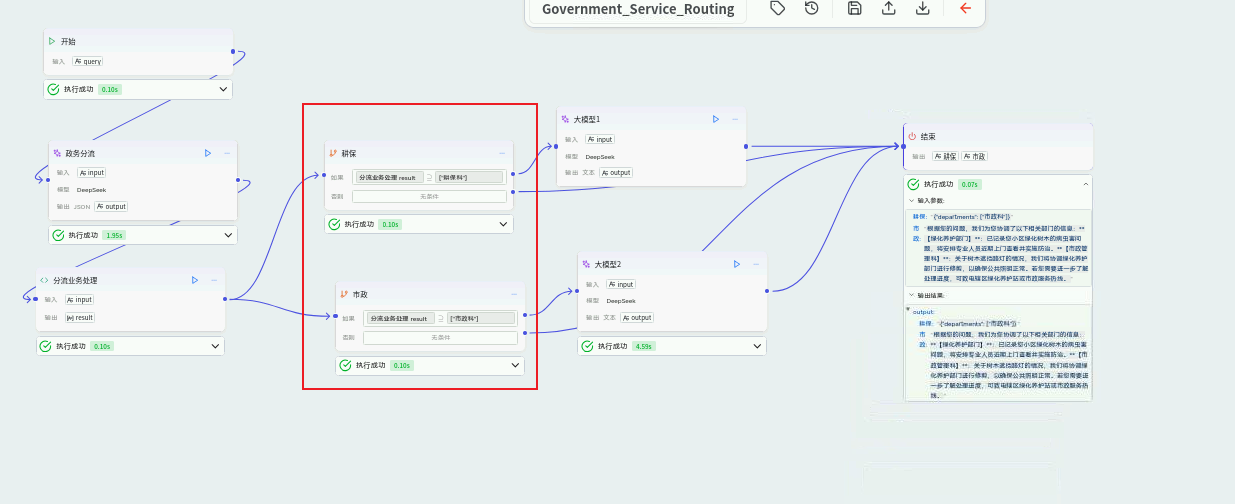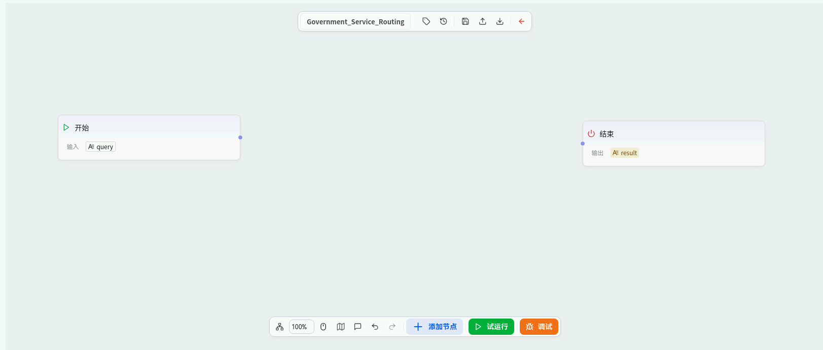 工作流是openJiuwen的灵魂,它将多个AI处理节点通过逻辑连接起来,形成一个完整的处理管道。我们将构建一个能根据市民/企业咨询内容,自动识别业务归属并分发给不同业务科室(如耕保科、市政科等)进行智能应答的工作流。