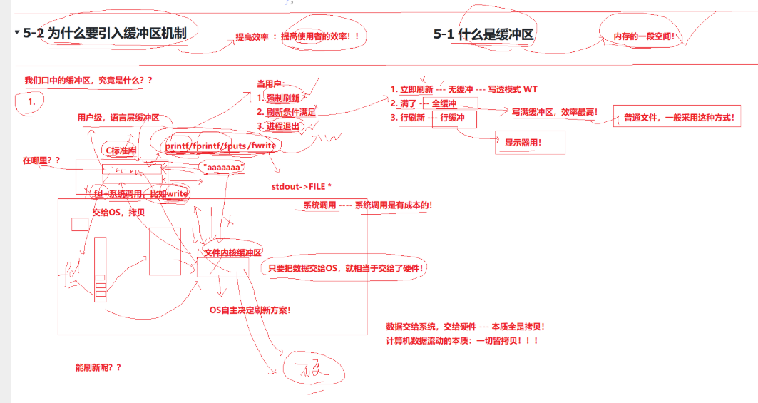 缓冲区就是内存的一段空间,c标准库的FIle结构体里存在用户级语言层缓冲区还有fd