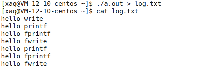 .因为/a.out是向显示器文件写入,所以行刷新,四条消息都打印出来了,而向log.txt文件写入时,在fork的时候,那三条消息还在缓冲区里,因为缓冲区没满不会刷新,fork完成后,父子进程各自刷新,而write是直接向内核缓冲区写入的,不存在用户向内核刷新的问题