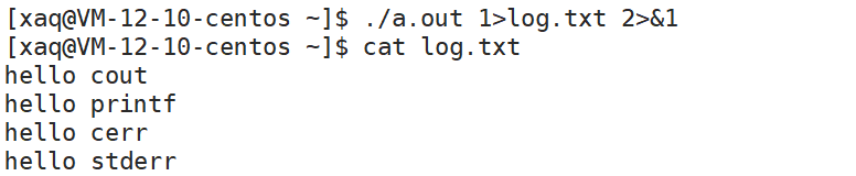 但是这里可以看到这里重定向后,只是把文件描述符1位置的指针指向变了,2并没有变,因为默认就是./a.out 1 >log.txt,只是我们不写1,默认就是1