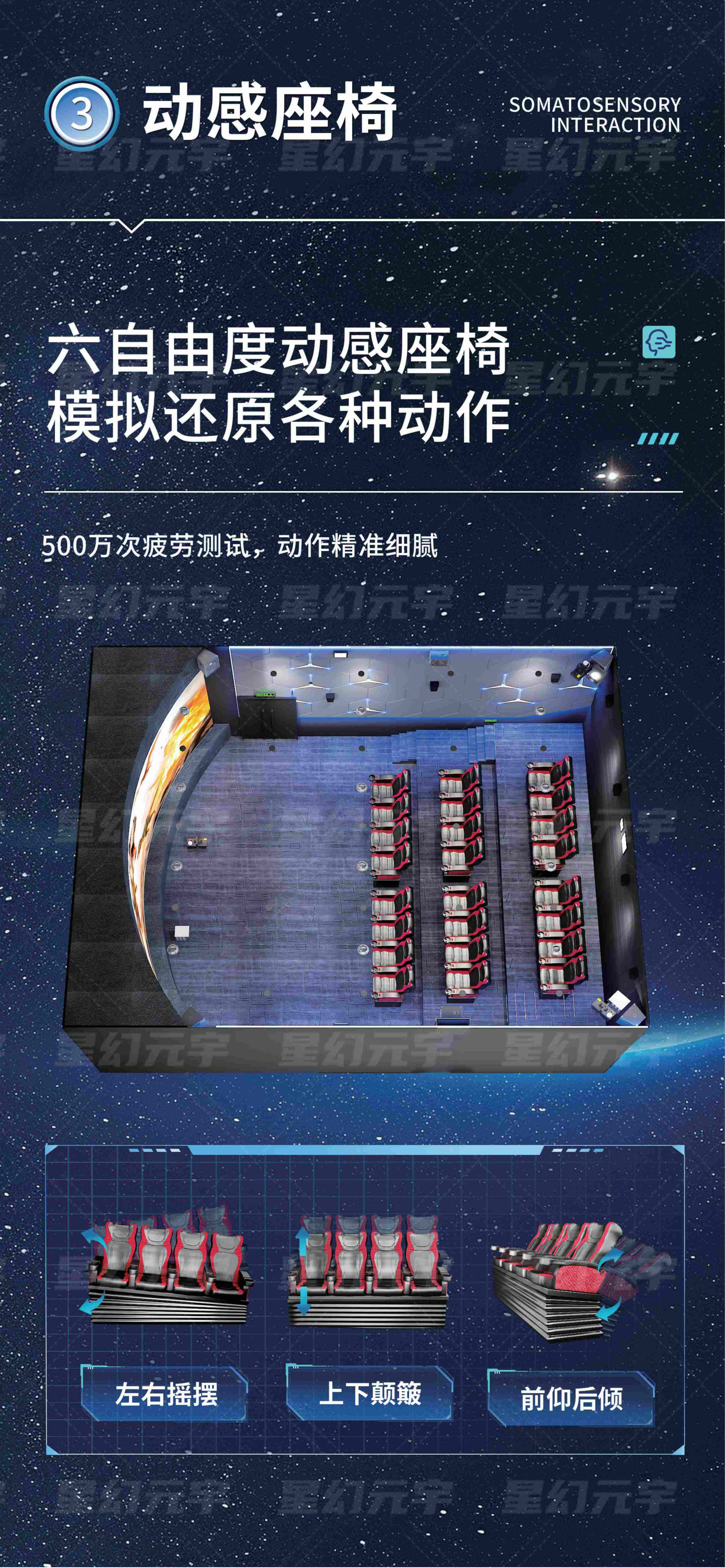 座椅联动反馈:根据电影情节控制座椅运动,实现追车、飞行、碰撞等动感效果。