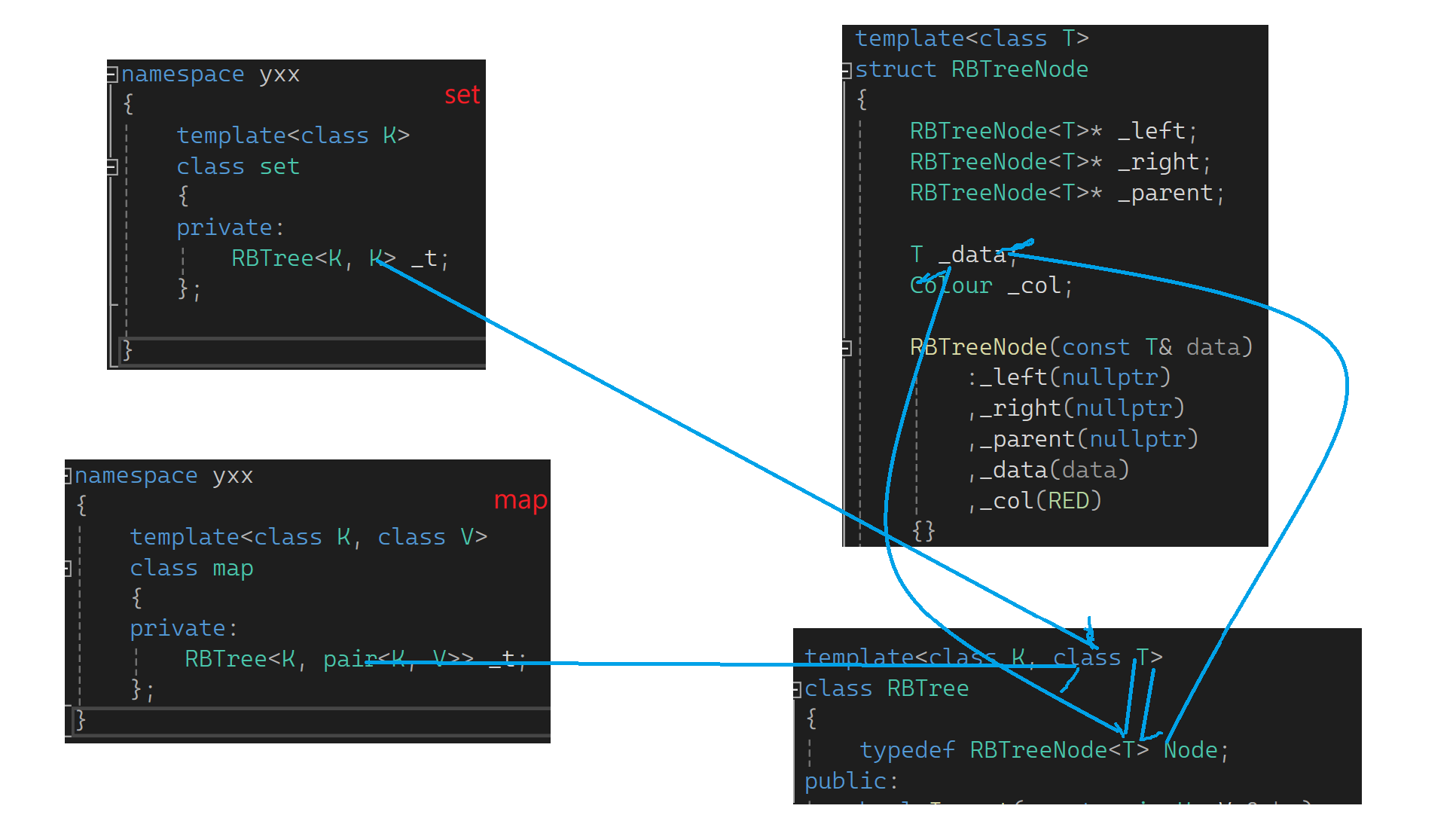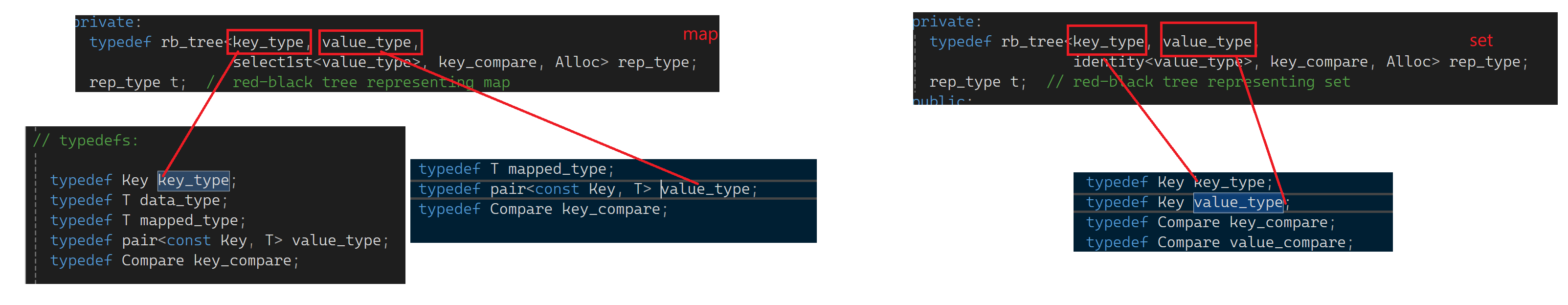 map这也弄的是kv结构的红黑树,这的key_type是key,value_type是个kv的pair。一个是<k,k>,另一个是<k, pair<k,v>>,想理解这里还要看一下tree.h: