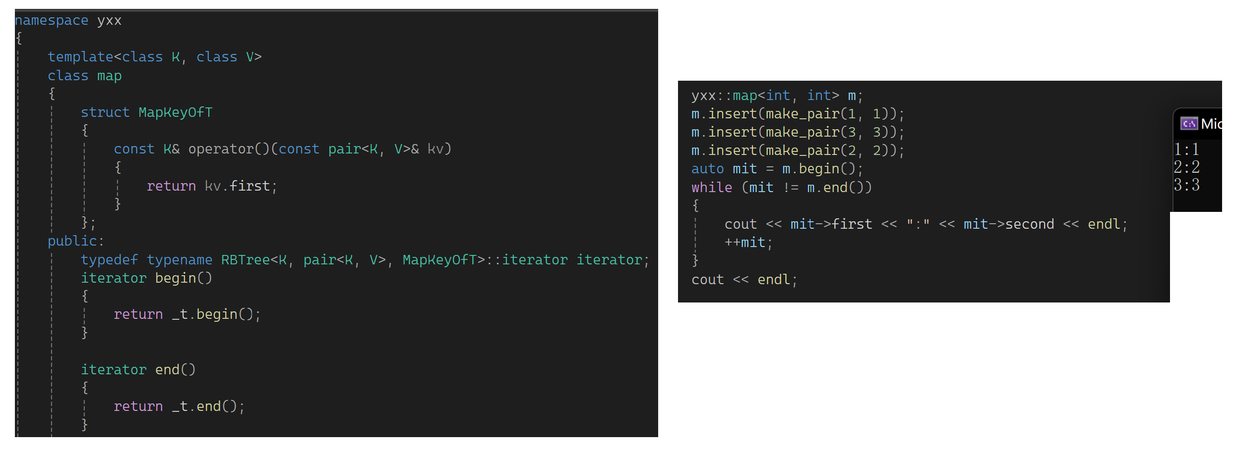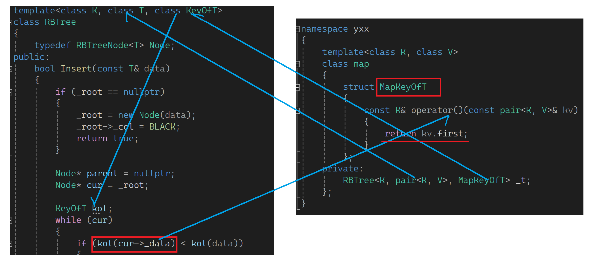以前存pair时知道用first比,现在的问题是插入大了往左走,小了往右走没有问题,但可以直接这样比较吗?对于set没什么问题,就是直接用data进行比较,对于setT实例化是K,就是K的比较。对于map来说T是pair,比较是用pair比的,更期望用pair的first来比较: