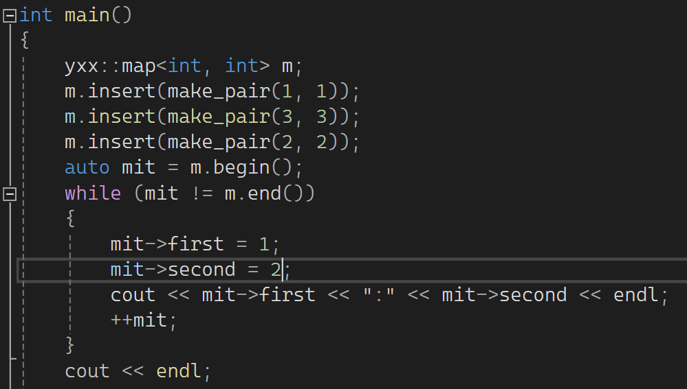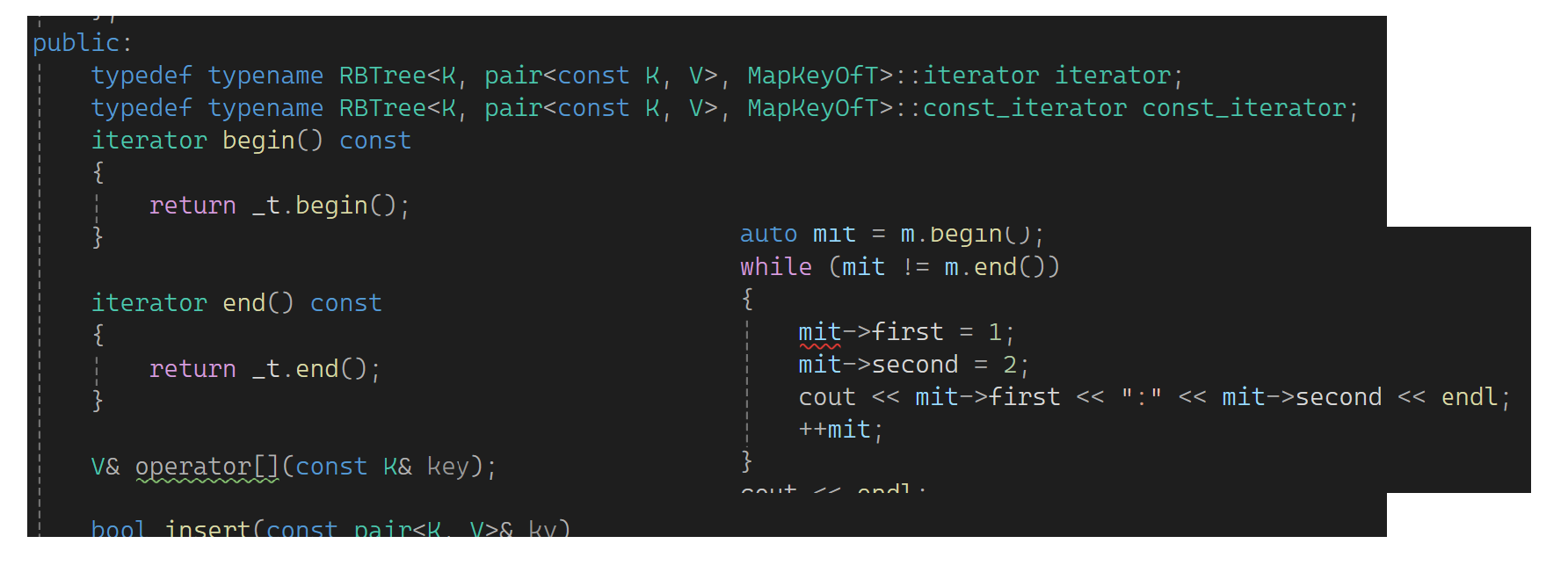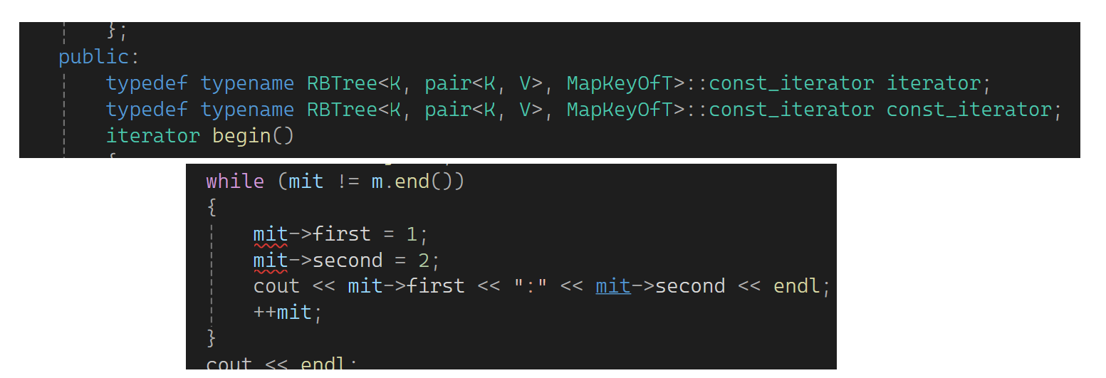 库里面const_iterator是const_iterator,iterator也是const_iterator。那map允许修改吗?允许修改value,不允许修改k。所以set的方案不能直接搞到map上,map这的迭代器是正常的: