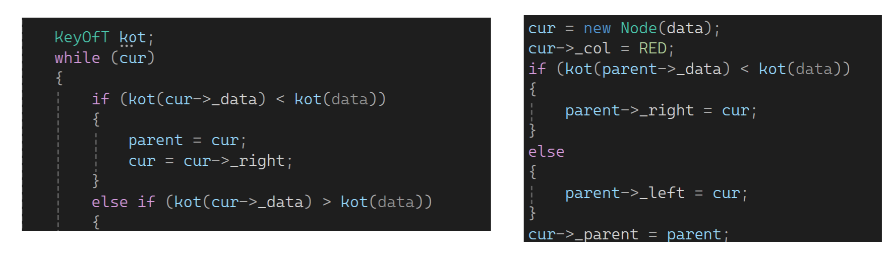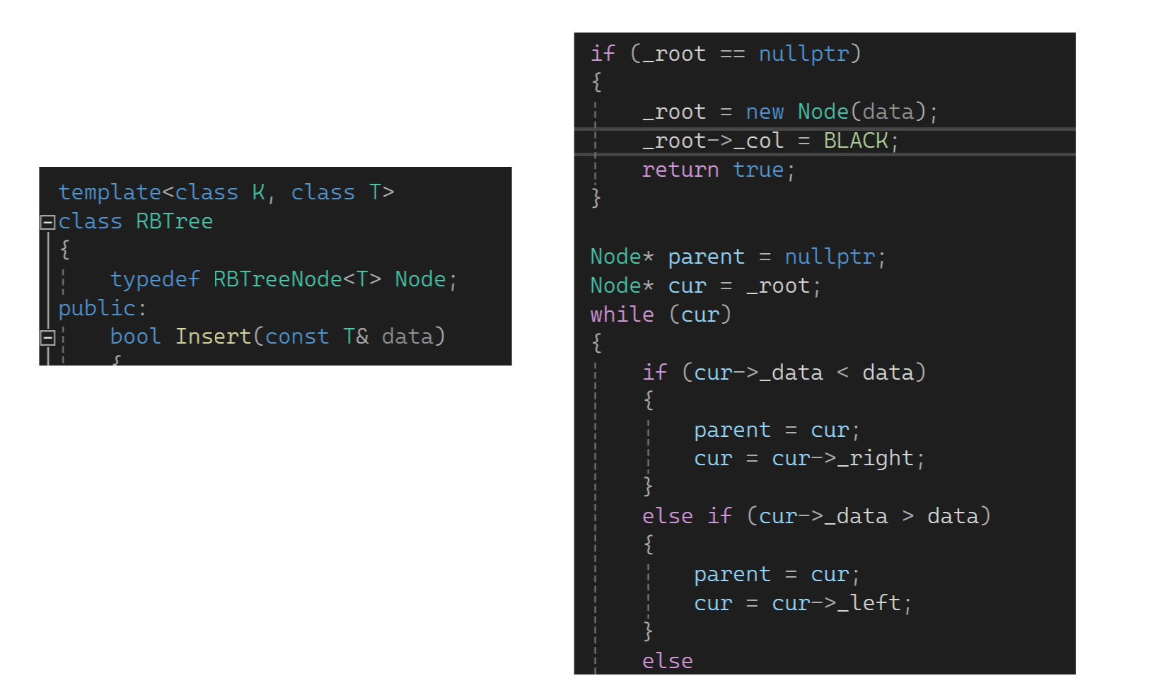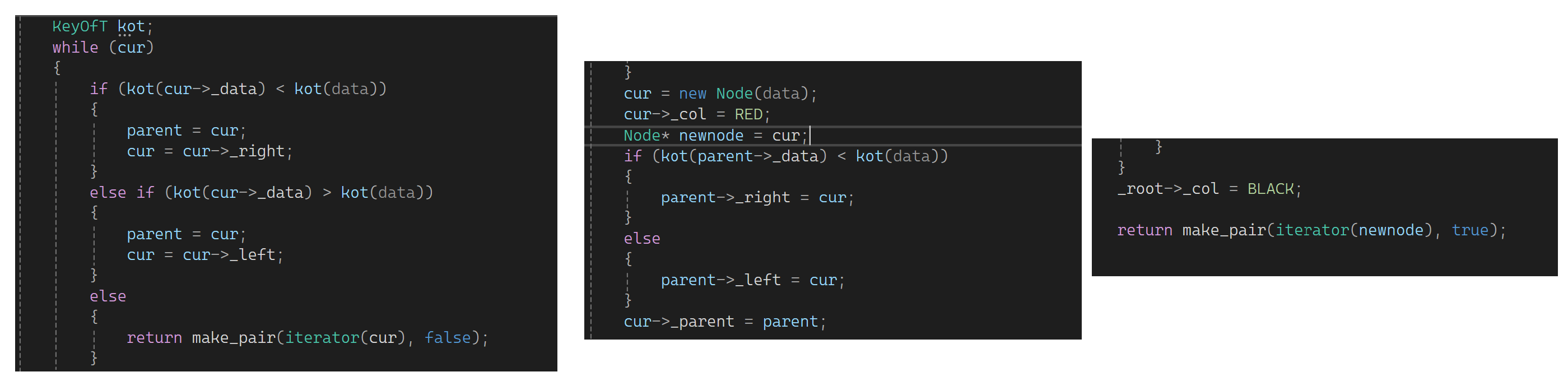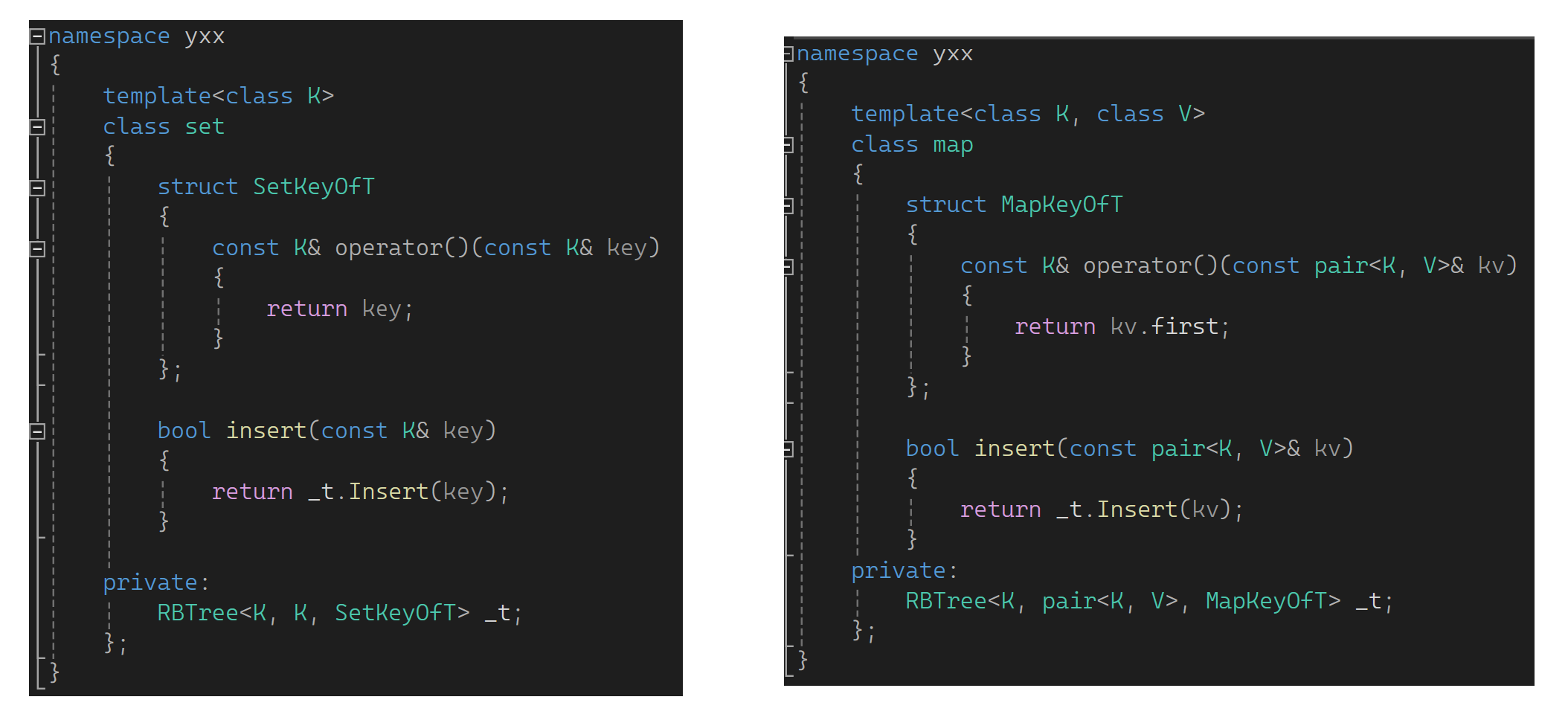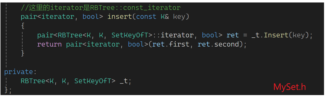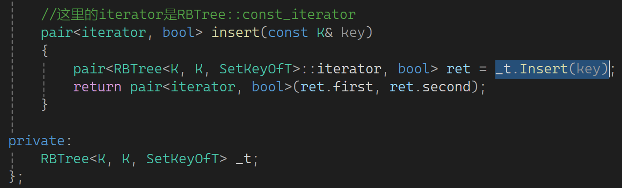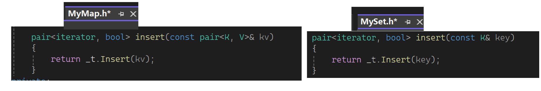 看到有一些问题,模板参数这里已经是T了,这里就不是KV了,改了后insert这的模板参数应该用T(对set来说插入K,对map来说插入pair)。因为RBTree这一层相当于是适配的泛型,不知道存的是k还是pair,T是什么存的就是什么,所以都改一下: