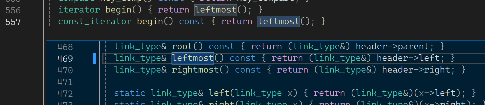 库里的begin返回的是一个leftmost,速览定义可以看到它返回header的left(会和我们的实现不一样)。先看看++怎么走?我们相当于不借助栈,完成中序的非递归。比如现在it在8这个位置,++怎么找到下一个结点: