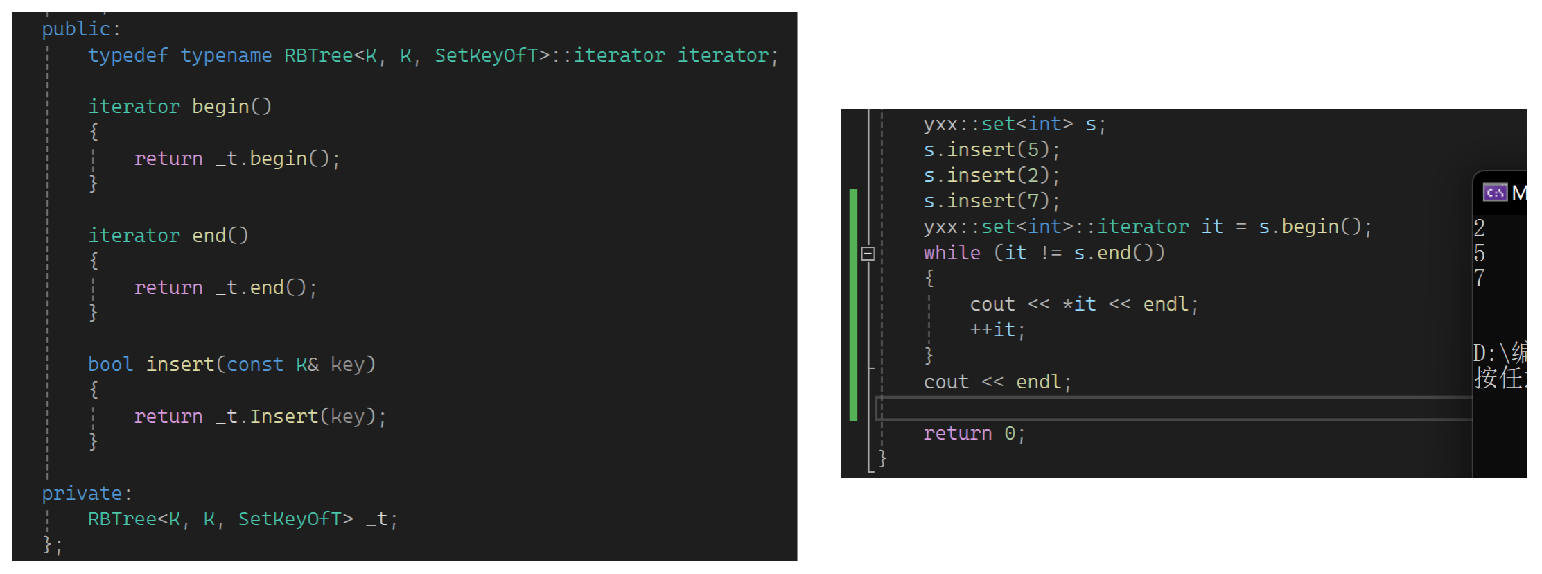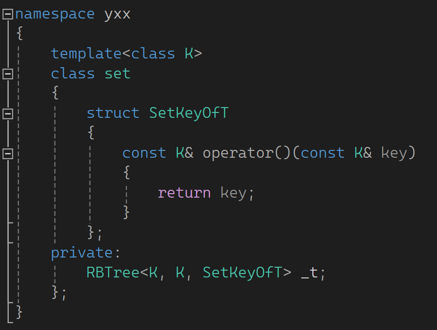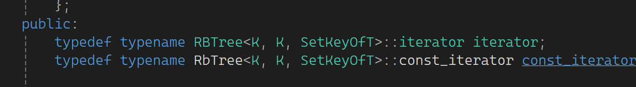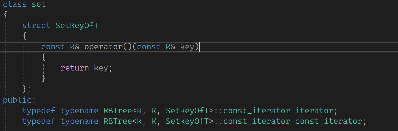 同时为了进行匹配底层同一个树,set中也定义SetKeyOfT,对于set而言传给T的是Key,就对照着返回就行: