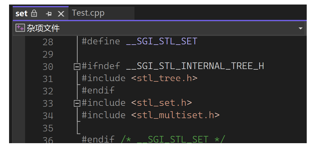 下面看看如何达到封装,首先看看源码:按我们的以前的理解我们包了map和set的头文件,但实际从源码角度map和set里面没有特别实质的内容,比如拿set来说: