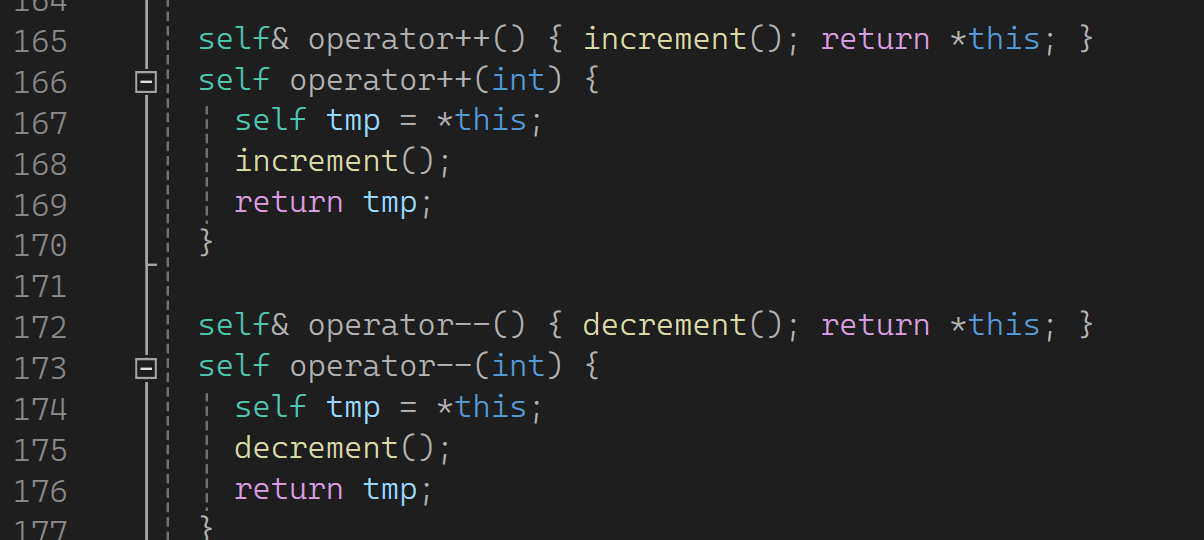 按理说迭代器不用写拷贝构造,编译器默认生成的拷贝就够了。但这里也不是纯拷贝构造,没有用self,仔细看self和iterator区别是什么?self一定是这个迭代器,iterator不一定是这个迭代器,那iterator是什么?再回顾一下: