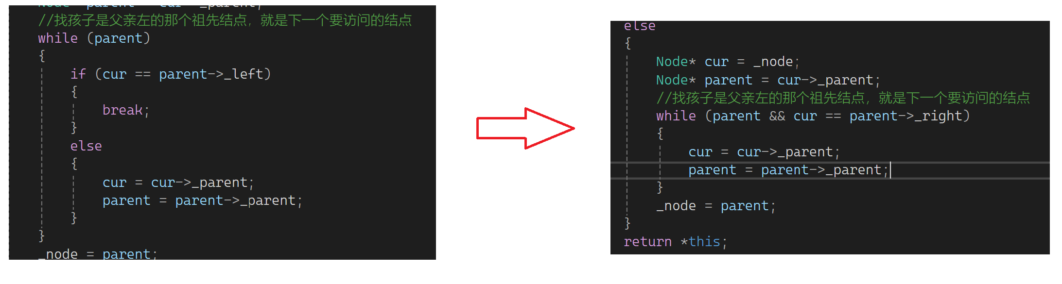 现在实现++,最开始整体的大逻辑是begin返回了第一个位置的迭代器,然后如果_node的right不为空,找右子树的最左结点,找到后给_node。else就是右为空,定义cur等于当前结点,然后去找它的父亲,在父亲不为空的情况下,如果cur等于父亲的左,下一个要访问的就是父亲;如果cur是父亲的右,就沿着往上走。else中while结束后有两种情况,要么cur等于父亲的左,也就找到了孩子是父亲左的那个祖先结点,就是下一个要访问的结点;要么父亲是空。无论哪一种情况都让_node指向父亲,最后返回迭代器本身: