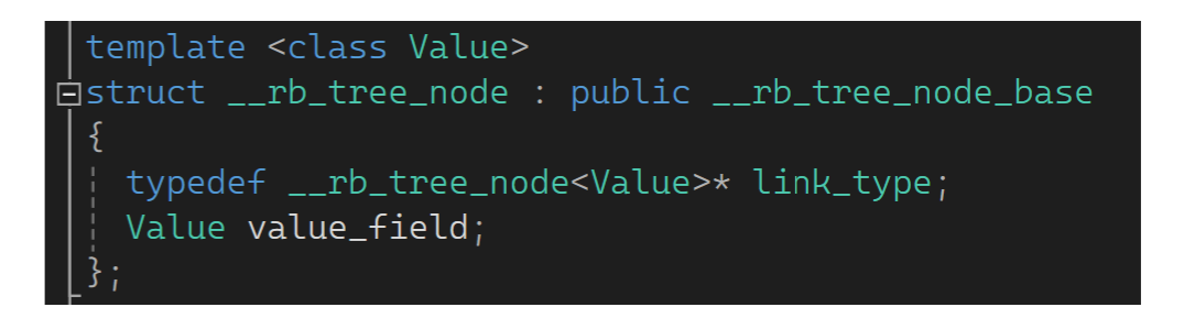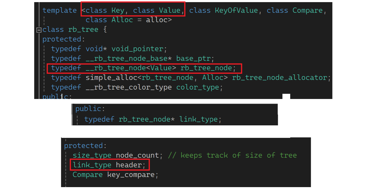 这里有个link_type的header,link_type又是rb_tree_node*类型的指针。再观察会发现这个树的结点里存的类型是第二个模板参数,对于rb_tree是value,但这个value不是真value。对于map而言这个value是个pair,意味着对map而言树的结点存的是pair;对于set而言树的结点存的是个k。意味着rb_tree真正决定树里面或结点里面存什么是由传的第二个模板参数决定的(继承了三叉链):