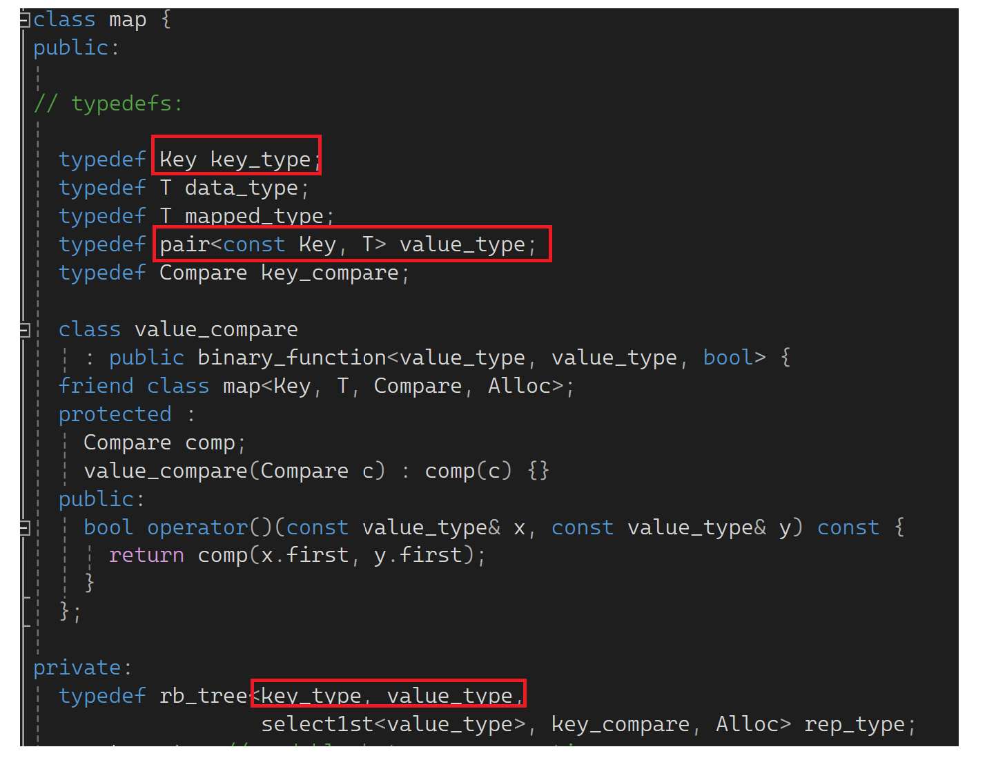 set这弄的红黑树是一个kv结构的,这写的是key_type和value_type,但从typedef角度来说都是Key。再看一下map.h核心: