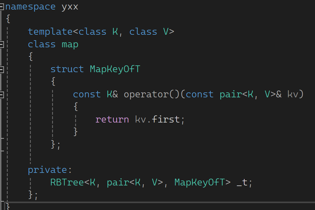 KeyOfT这里传进来一个仿函数,那怎么传呢?这里定义一个内部类,Map中定义MapKeyofT,它的责任是把Map传给T的值(pair)中的first取出来: