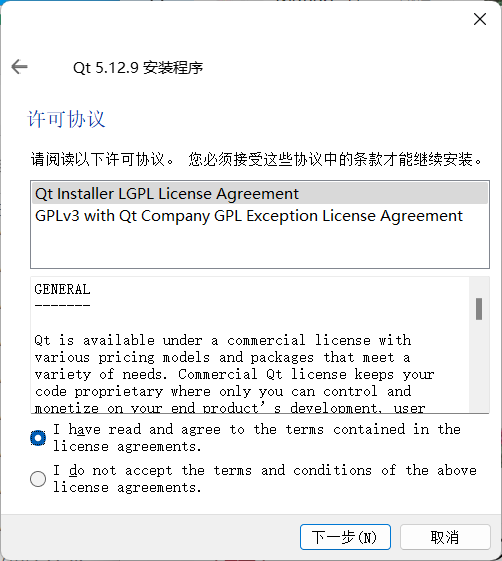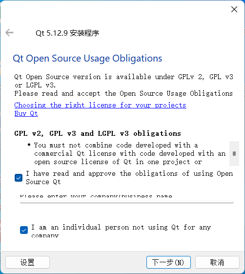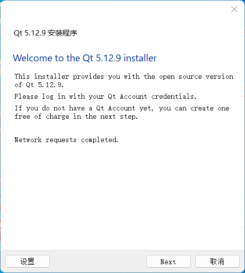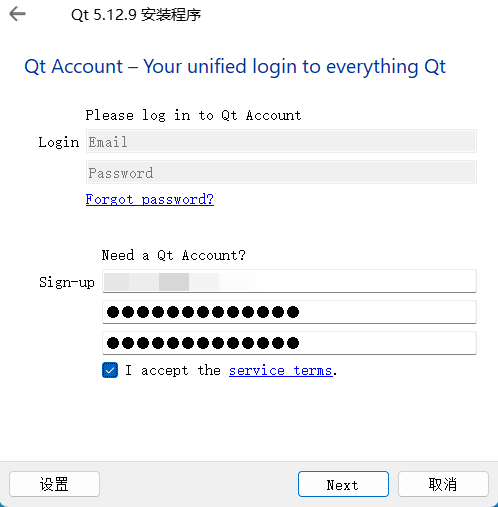 新创建一个Qt账户并接受服务协议、依次单击Next按钮、"下一步"按钮,"下一步"按钮。