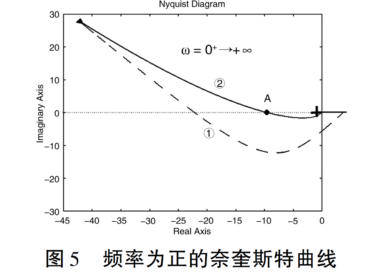 但正如前文所说,奈奎斯特曲线是关于实轴对称的,因此可以只研究曲线的一半即可了解整个曲线的性质。在教学过程中,主要关注的是ω 从0 + → + ∞的曲线,即正频率段的奈奎斯特曲线。使用Matlab 软件,通过参数设置绘制频率为正的奈奎斯特曲线,如图5 中实线所示。接下来,利用图5 进行系统稳定性分析。