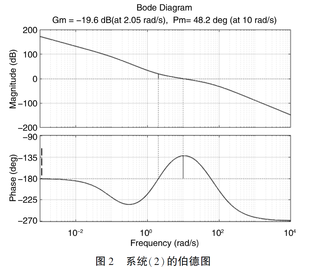 依据幅频特性(4)和相频特性(5)可得到本系统的伯德图,采用Matlab 程序更为方便,伯德图如图2 所示。从图2 中可看出,系统的相位裕度Pm = 48.2°,ωc = 10rad/ s,增益裕度Gm = -19. 6dB,ωg = 2.05rad/ s。可见,系统的相位裕度为正,而增益裕度为负。