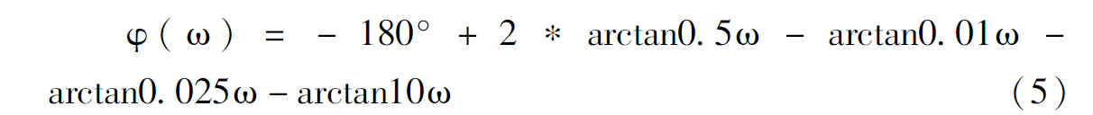 对于这个系统,简单地使用伯德稳定判据的推论,不能得到系统是否稳定的明确结论,需要采用其它办法。由于系统是II 型系统,需要在相频曲线的左端向上补90° ×2 =180°,如图2 中的虚线所示。在采用伯德判据进行系统稳定性判断时,应该认为系统相频特性曲线是从0°→180°再连接到实际相频特性曲线。