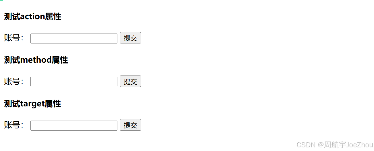 | submit | 提交按钮 | 点击后提交表单数据 | formaction:重写表单 action(提交地址) formmethod:重写表单 method(提交方式) formtarget:重写表单 target(显示目标) |