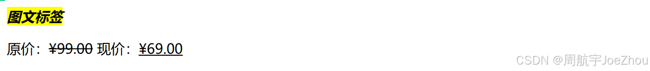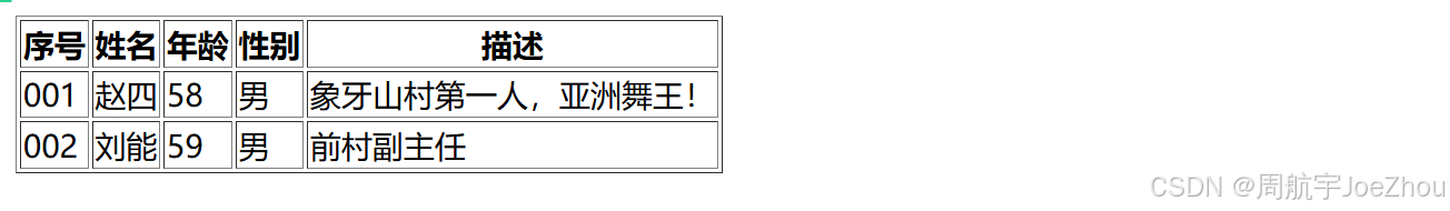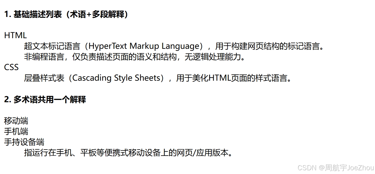 | H5 标签 | 描述功能 | 由 <> 和小写字母组成,分两种: 单标签 :不需 "夹" 内容,如 <br>,<hr>,<img> 等(H5 规范中,自闭合标签无需写末尾斜线) 双标签 :需要 "夹" 内容,如 <p>内容</p>,<ul><li>JoeZhou</li></ul>等 |