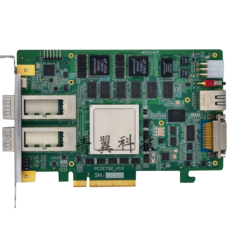 PCIE732 是一款基于 PCIE 总线架构 Kintex UltraScale FPGA 的 2 路 40G 光纤通道适配器,该板卡具有 1 个 PCIe Gen3 x8 主机接 口、2 个 QSFP+ 40G 光纤接口,可以实现 2 路 QSFP+ 40G 光纤(或 者 8 路 10Gbps 光纤)的数据实时采集、处理、传输。该板卡采用 Xilinx 的 16nm 高性能 Kintex UltraScale 系列 FPGA 作为主处理器,板载 2 组独立的 72 位 DDR4 SDRAM 大容量缓