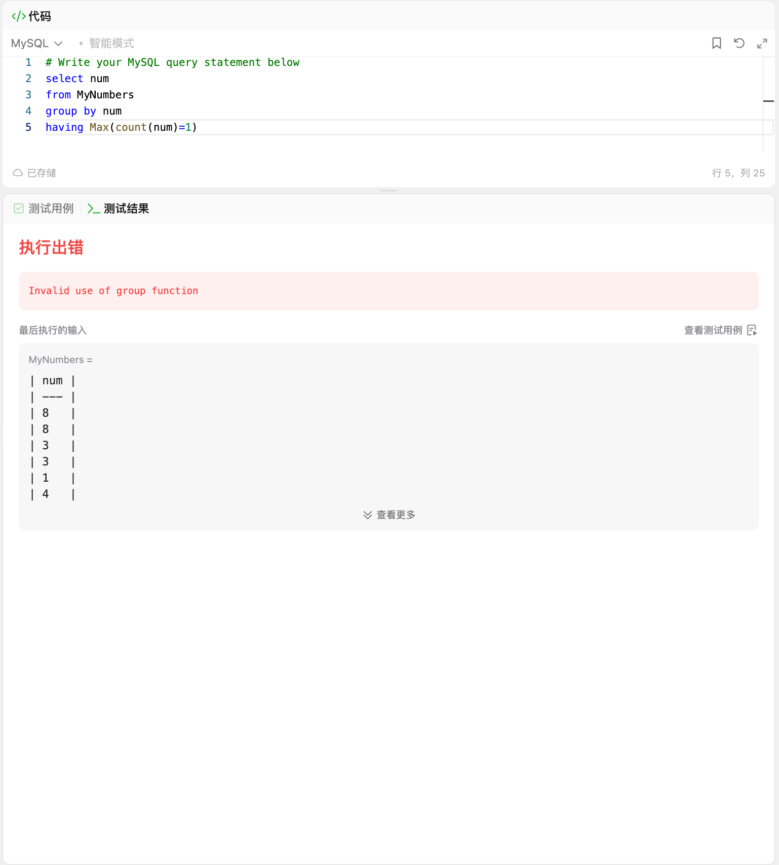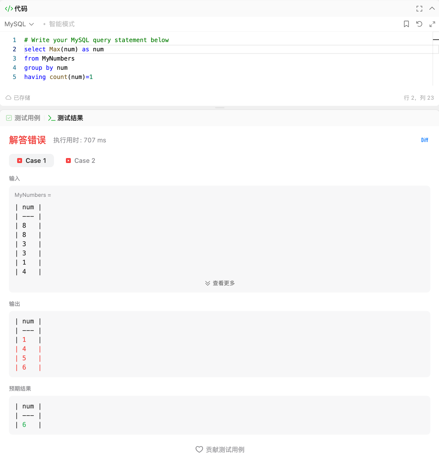 需要先把「出现次数=1的所有num」放到一个临时表,再对这个临时表取MAX(),才能得到这些数的最大值: