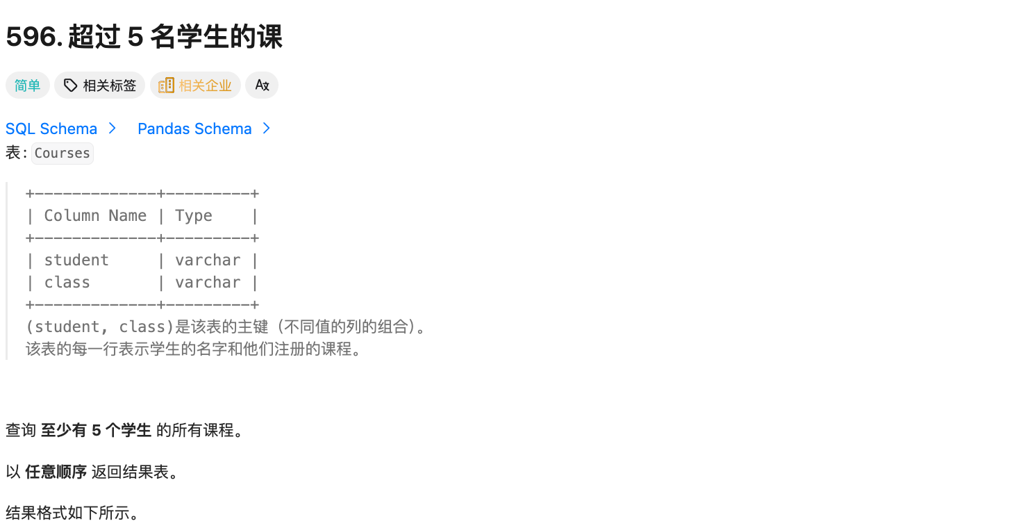 当题目要求统计「种类/唯一数量」时,必须用COUNT(DISTINCT 字段)------它会自动过滤字段的重复值,只统计不同值的数量;而普通的COUNT(字段)统计的是「字段出现的总次数」(包含重复)。