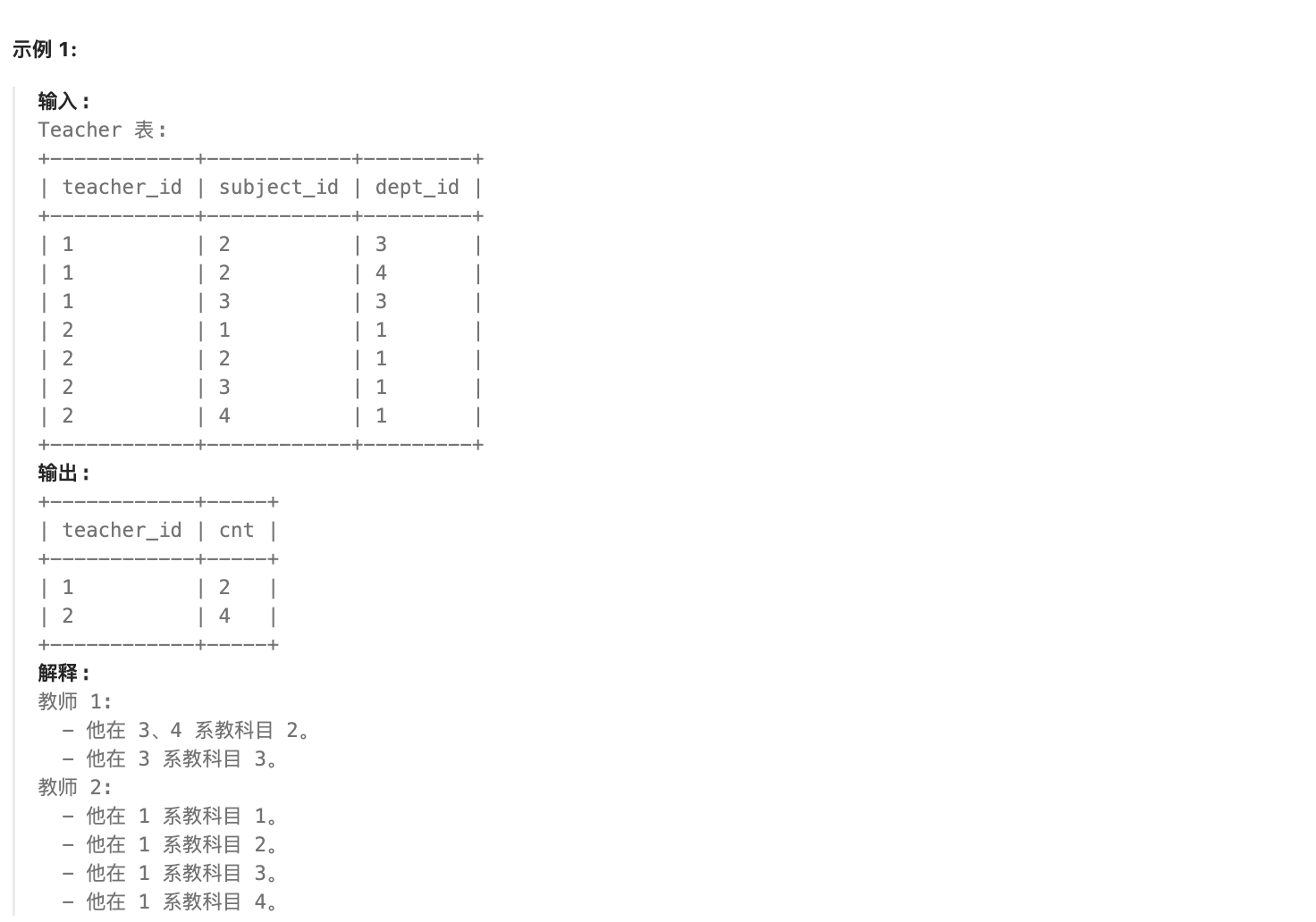 题目中Teacher表的主键是(subject_id, dept_id)------这意味着:同一个教师(teacher_id)可能在不同部门(dept_id),教授同一个科目(subject_id)。