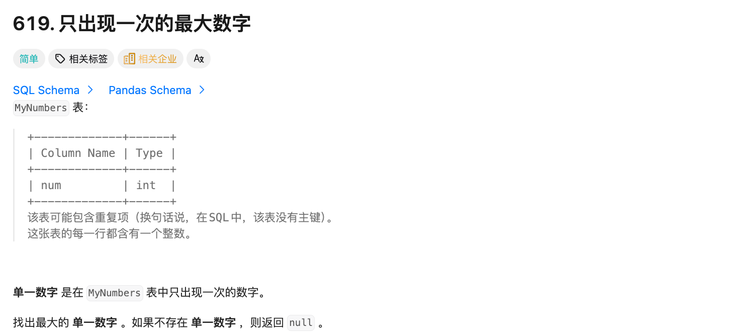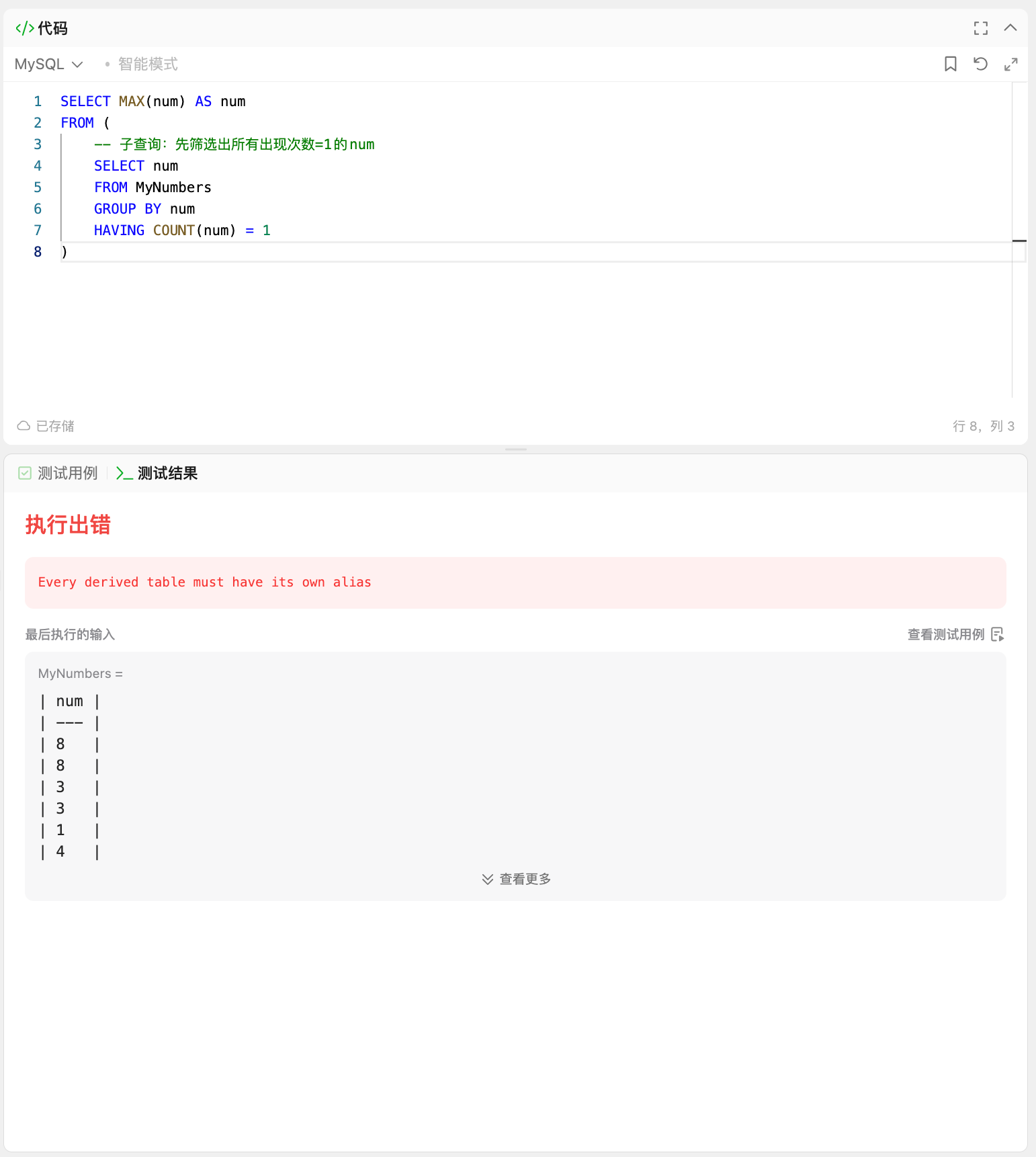 GROUP BY num→ 按num分组(比如输入中的num=8是一个分组、num=3是一个分组、num=1是一个分组......);HAVING COUNT(num)=1→ 筛选出「出现次数=1」的分组(比如num=1、num=4、num=6这些分组);SELECT MAX(num)→ 对每个分组 取MAX(num)(但每个分组只有一个num,所以MAX(num)就是分组自己的num)。
