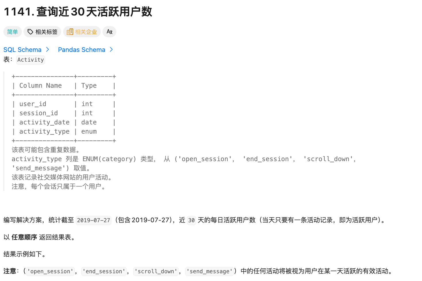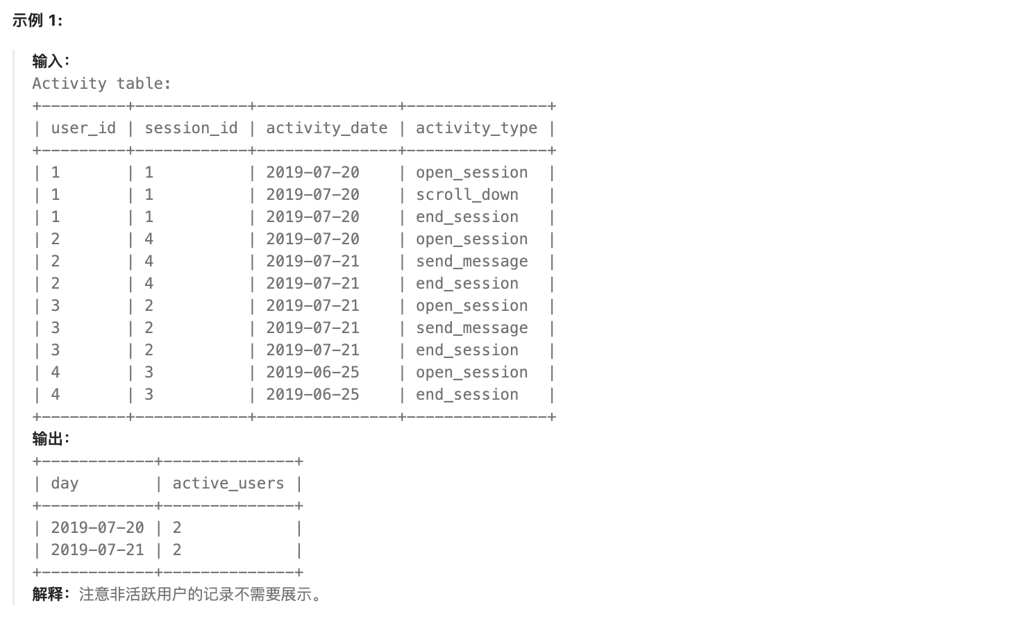 要解决这道题,核心是筛选时间范围+按日期分组+去重统计活跃用户