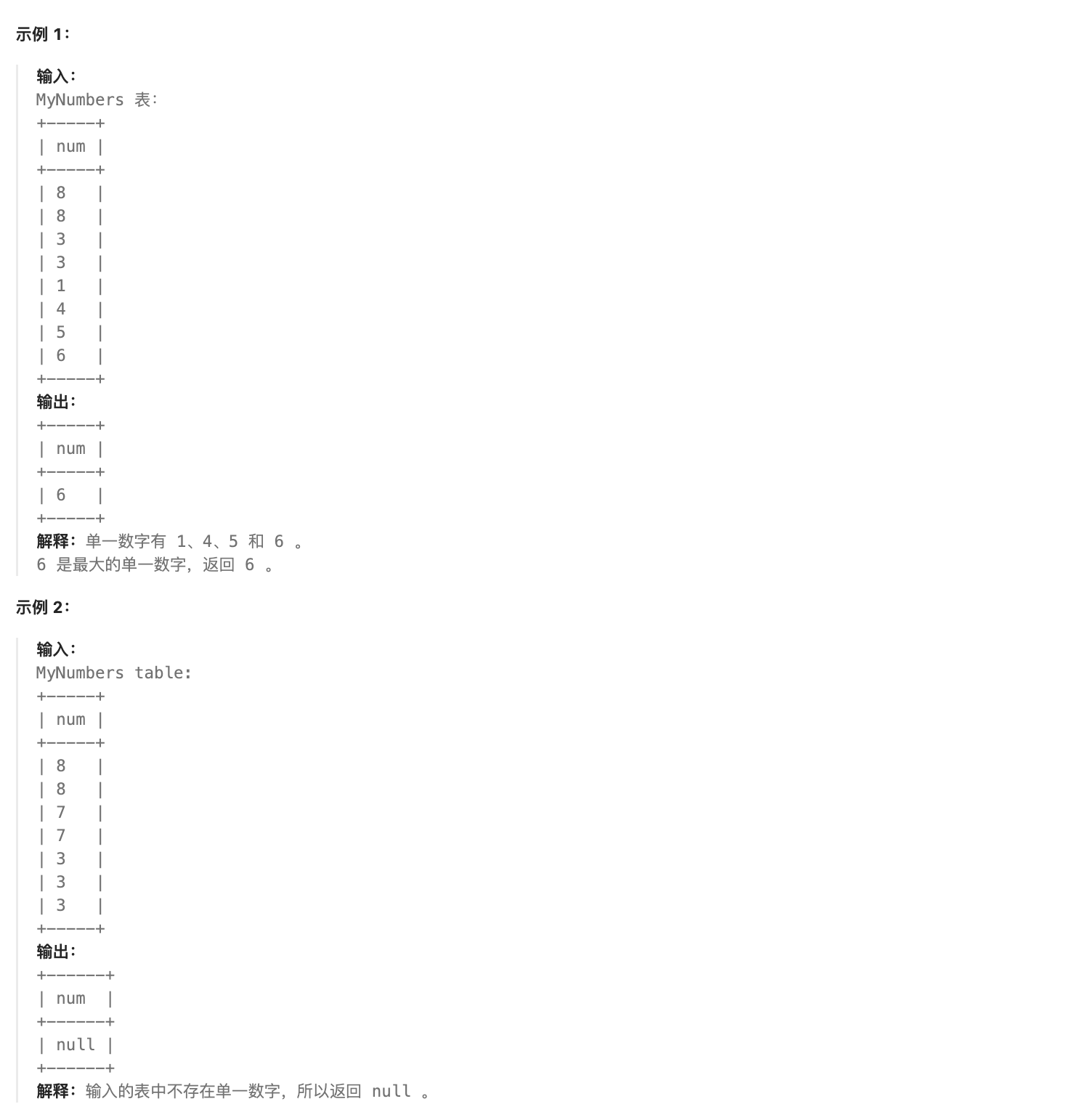 COUNT(num)=1的num); - 再从这些数字中找「最大值」;